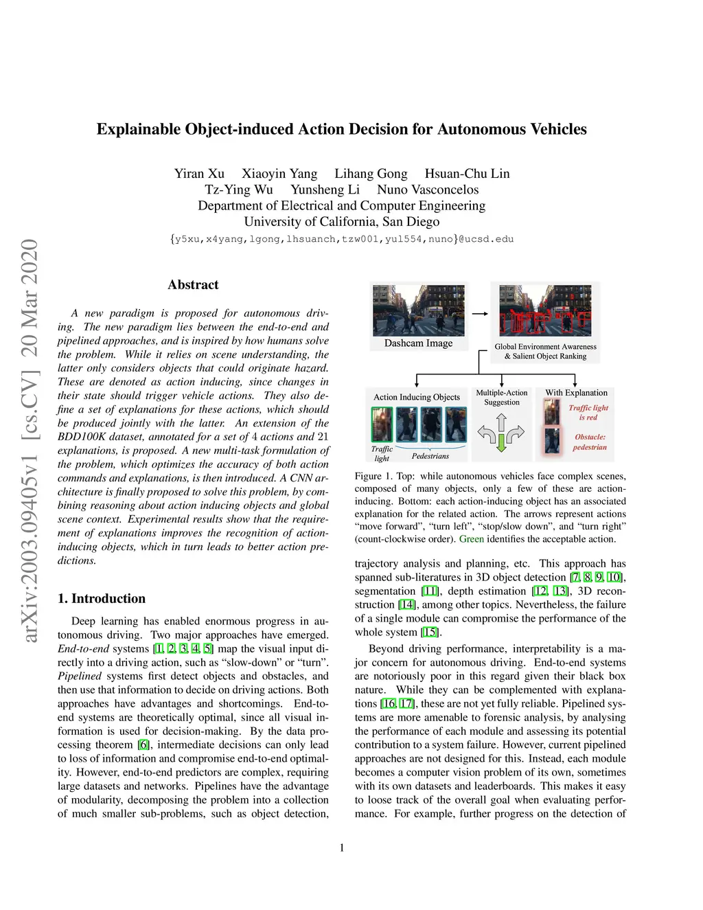 A new paradigm is proposed for autonomous driving. The new paradigm lies between the end-to-end and pipelined approaches, and is inspired by how humans solve the problem. While it relies on scene understanding, the latter only considers objects that could originate hazard. These are denoted as action-inducing, since changes in their state should trigger vehicle actions. They also define a set of explanations for these actions, which should be produced jointly with the latter. An extension of the BDD100K dataset, annotated for a set of 4 actions and 21 explanations, is proposed. A new multi-task formulation of the problem, which optimizes the accuracy of both action commands and explanations, is then introduced. A CNN architecture is finally proposed to solve this problem, by combining reasoning about action inducing objects and global scene context. Experimental results show that the requirement of explanations improves the recognition of action-inducing objects, which in turn leads to better action predictions.