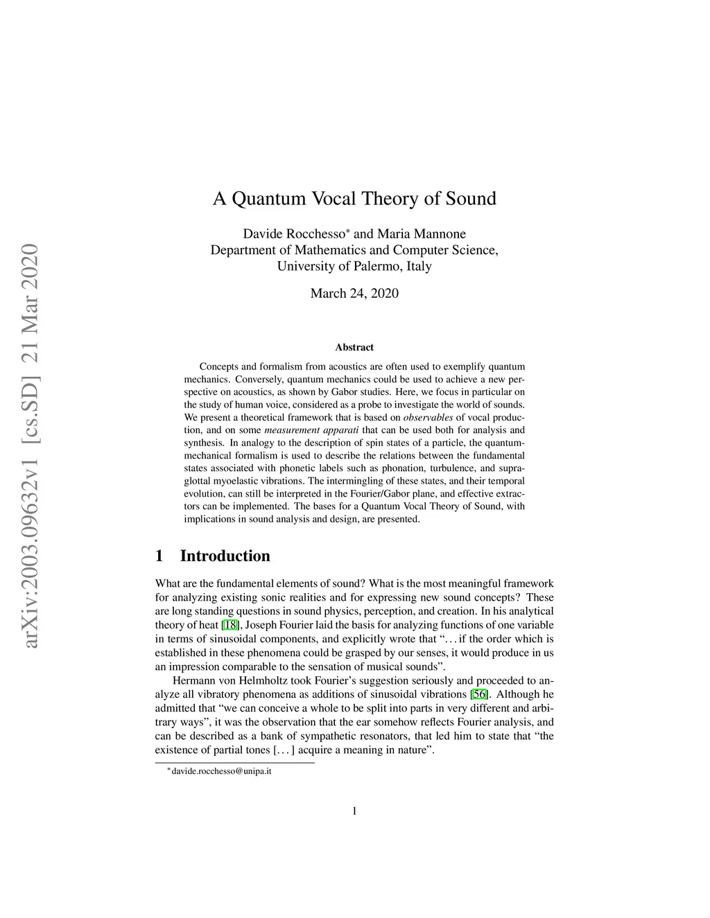 Concepts and formalism from acoustics are often used to exemplify quantum mechanics. Conversely, quantum mechanics could be used to achieve a new perspective on acoustics, as shown by Gabor studies. Here, we focus in particular on the study of human voice, considered as a probe to investigate the world of sounds. We present a theoretical framework that is based on observables of vocal production, and on some measurement apparati that can be used both for analysis and synthesis. In analogy to the description of spin states of a particle, the quantum-mechanical formalism is used to describe the relations between the fundamental states associated with phonetic labels such as phonation, turbulence, and supraglottal myoelastic vibrations. The intermingling of these states, and their temporal evolution, can still be interpreted in the Fourier/Gabor plane, and effective extractors can be implemented. The bases for a Quantum Vocal Theory of Sound, with implications in sound analysis and design, are presented.