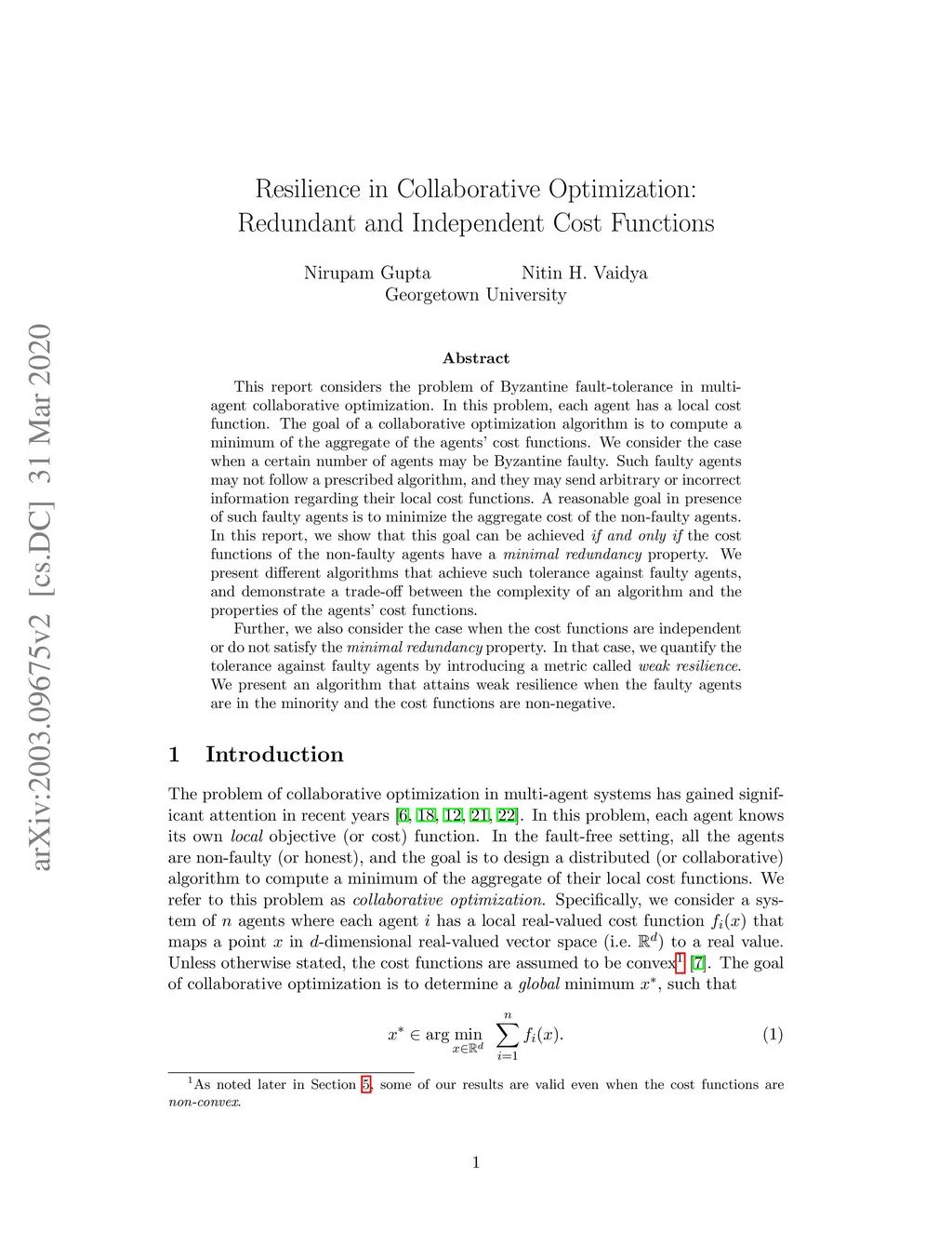 Resilience in Collaborative Optimization: Redundant and Independent Cost