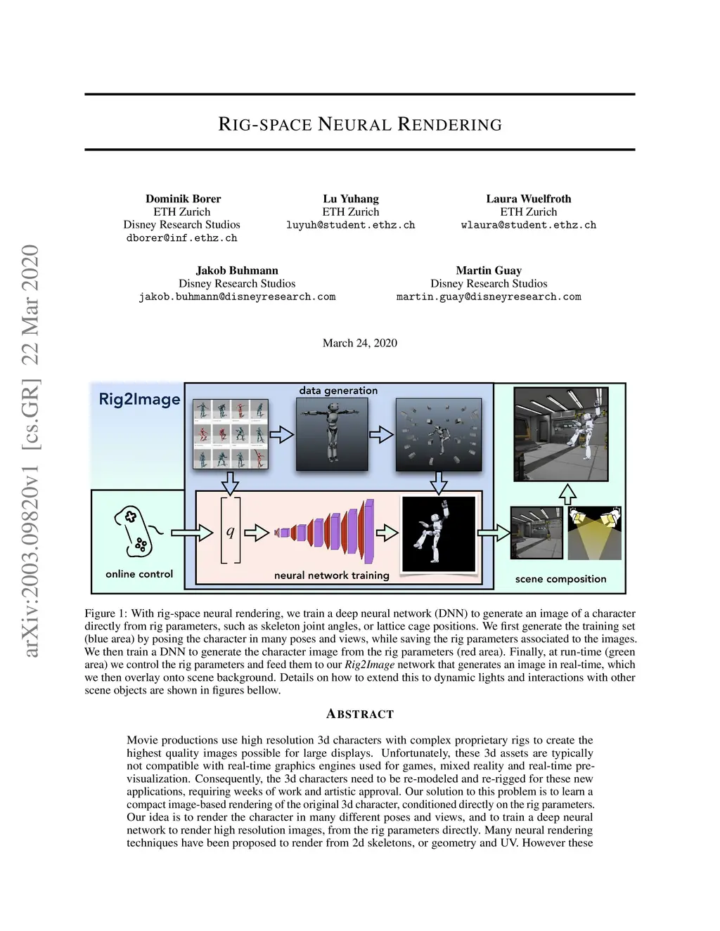 Movie productions use high resolution 3d characters with complex proprietary rigs to create the highest quality images possible for large displays. Unfortunately, these 3d assets are typically not compatible with real-time graphics engines used for games, mixed reality and real-time pre-visualization. Consequently, the 3d characters need to be re-modeled and re-rigged for these new applications, requiring weeks of work and artistic approval. Our solution to this problem is to learn a compact image-based rendering of the original 3d character, conditioned directly on the rig parameters. Our idea is to render the character in many different poses and views, and to train a deep neural network to render high resolution images, from the rig parameters directly. Many neural rendering techniques have been proposed to render from 2d skeletons, or geometry and UV maps. However these require manual work, and to do not remain compatible with the animator workflow of manipulating rig widgets, as well as the real-time game engine pipeline of interpolating rig parameters. We extend our architecture to support dynamic re-lighting and composition with other 3d objects in the scene. We designed a network that efficiently generates multiple scene feature maps such as normals, depth, albedo and mask, which are composed with other scene objects to form the final image.