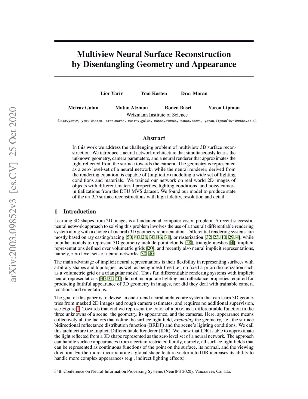 In this work we address the challenging problem of multiview 3D surface reconstruction. We introduce a neural network architecture that simultaneously learns the unknown geometry, camera parameters, and a neural renderer that approximates the light reflected from the surface towards the camera. The geometry is represented as a zero level-set of a neural network, while the neural renderer, derived from the rendering equation, is capable of (implicitly) modeling a wide set of lighting conditions and materials. We trained our network on real world 2D images of objects with different material properties, lighting conditions, and noisy camera initializations from the DTU MVS dataset. We found our model to produce state of the art 3D surface reconstructions with high fidelity, resolution and detail.