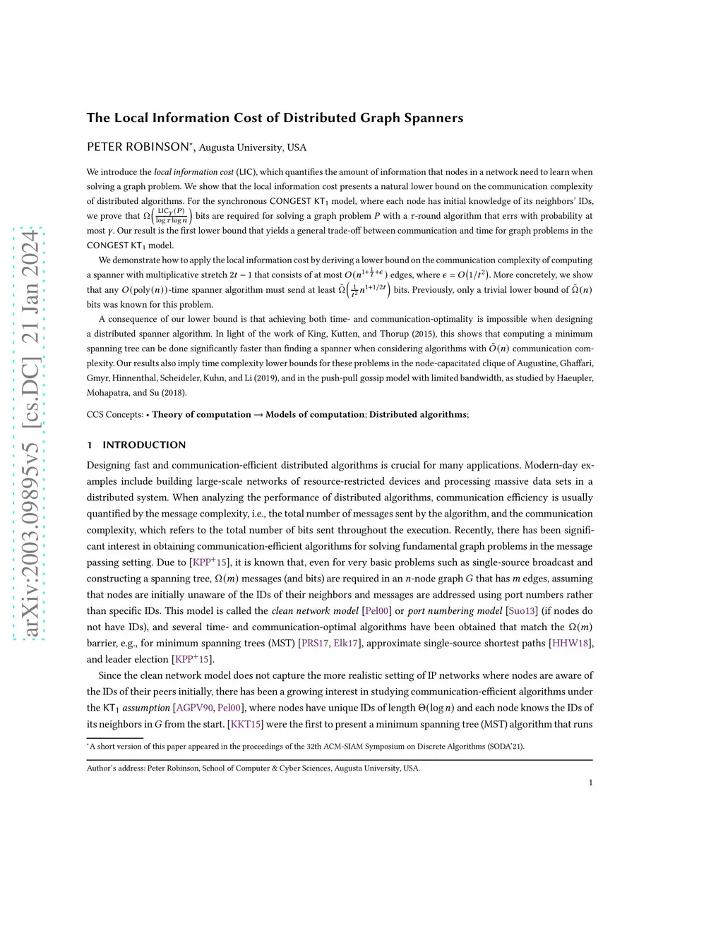 We introduce a new measure for quantifying the amount of information that the nodes in a network need to learn to jointly solve a graph problem. We show that the local information cost () presents a natural lower bound on the communication complexity of distributed algorithms. For the synchronous CONGEST-KT1 model, where each node has initial knowledge of its neighbors' IDs, we prove that bits are required for solving a graph problem with a -round algorithm that errs with probability at most . Our result is the first lower bound that yields a general trade-off between communication and time for graph problems in the CONGEST-KT1 model. We demonstrate how to apply the local information cost by deriving a lower bound on the communication complexity of computing a -spanner that consists of at most edges, where . Our main result is that any -time algorithm must send at least bits in the CONGEST model under the KT1 assumption. Previously, only a trivial lower bound of bits was known for this problem. A consequence of our lower bound is that achieving both time- and communication-optimality is impossible when designing a distributed spanner algorithm. In light of the work of King, Kutten, and Thorup (PODC 2015), this shows that computing a minimum spanning tree can be done significantly faster than finding a spanner when considering algorithms with communication complexity. Our result also implies time complexity lower bounds for constructing a spanner in the node-congested clique of Augustine et al. (2019) and in the push-pull gossip model with limited bandwidth.