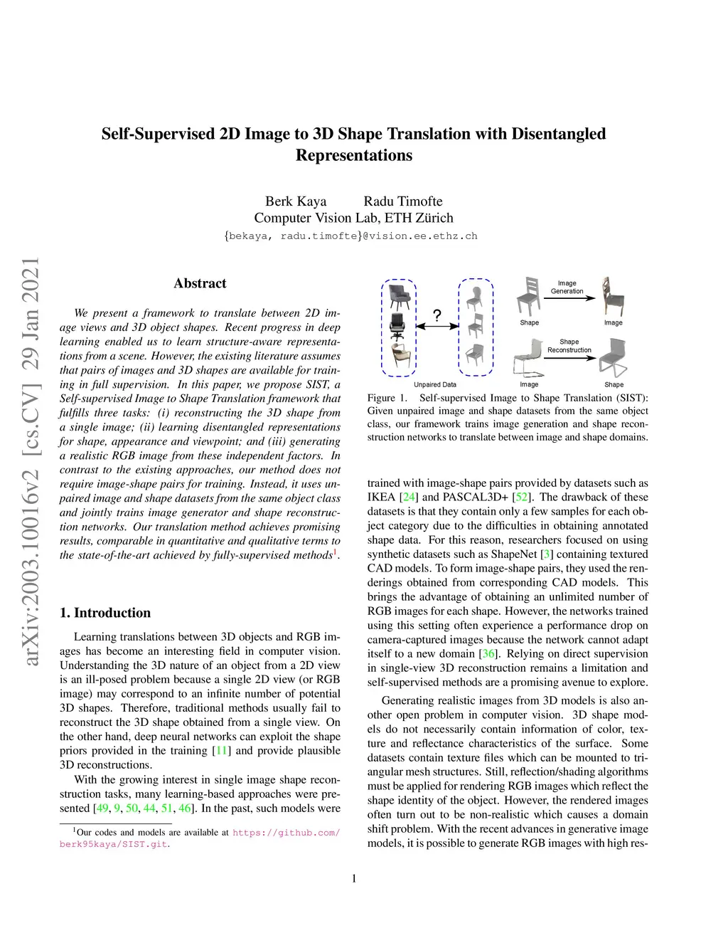 We present a framework to translate between 2D image views and 3D object shapes. Recent progress in deep learning enabled us to learn structure-aware representations from a scene. However, the existing literature assumes that pairs of images and 3D shapes are available for training in full supervision. In this paper, we propose SIST, a Self-supervised Image to Shape Translation framework that fulfills three tasks: (i) reconstructing the 3D shape from a single image; (ii) learning disentangled representations for shape, appearance and viewpoint; and (iii) generating a realistic RGB image from these independent factors. In contrast to the existing approaches, our method does not require image-shape pairs for training. Instead, it uses unpaired image and shape datasets from the same object class and jointly trains image generator and shape reconstruction networks. Our translation method achieves promising results, comparable in quantitative and qualitative terms to the state-of-the-art achieved by fully-supervised methods.