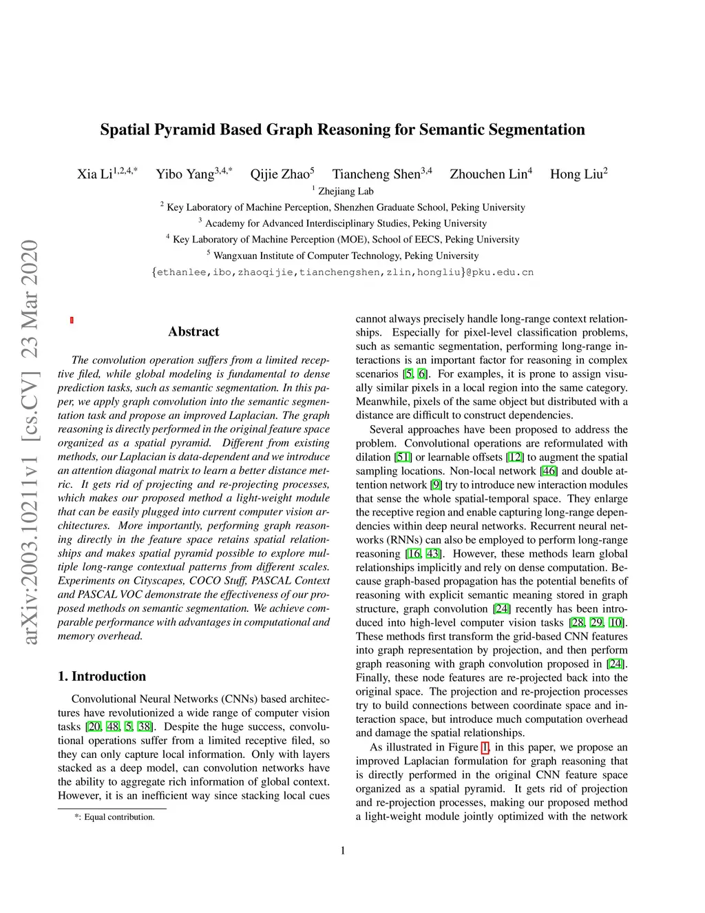 The convolution operation suffers from a limited receptive filed, while global modeling is fundamental to dense prediction tasks, such as semantic segmentation. In this paper, we apply graph convolution into the semantic segmentation task and propose an improved Laplacian. The graph reasoning is directly performed in the original feature space organized as a spatial pyramid. Different from existing methods, our Laplacian is data-dependent and we introduce an attention diagonal matrix to learn a better distance metric. It gets rid of projecting and re-projecting processes, which makes our proposed method a light-weight module that can be easily plugged into current computer vision architectures. More importantly, performing graph reasoning directly in the feature space retains spatial relationships and makes spatial pyramid possible to explore multiple long-range contextual patterns from different scales. Experiments on Cityscapes, COCO Stuff, PASCAL Context and PASCAL VOC demonstrate the effectiveness of our proposed methods on semantic segmentation. We achieve comparable performance with advantages in computational and memory overhead.