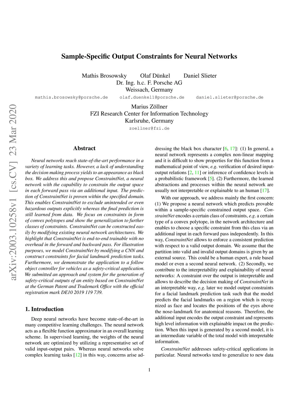 Neural networks reach state-of-the-art performance in a variety of learning tasks. However, a lack of understanding the decision making process yields to an appearance as black box. We address this and propose ConstraintNet, a neural network with the capability to constrain the output space in each forward pass via an additional input. The prediction of ConstraintNet is proven within the specified domain. This enables ConstraintNet to exclude unintended or even hazardous outputs explicitly whereas the final prediction is still learned from data. We focus on constraints in form of convex polytopes and show the generalization to further classes of constraints. ConstraintNet can be constructed easily by modifying existing neural network architectures. We highlight that ConstraintNet is end-to-end trainable with no overhead in the forward and backward pass. For illustration purposes, we model ConstraintNet by modifying a CNN and construct constraints for facial landmark prediction tasks. Furthermore, we demonstrate the application to a follow object controller for vehicles as a safety-critical application. We submitted an approach and system for the generation of safety-critical outputs of an entity based on ConstraintNet at the German Patent and Trademark Office with the official registration mark DE10 2019 119 739.