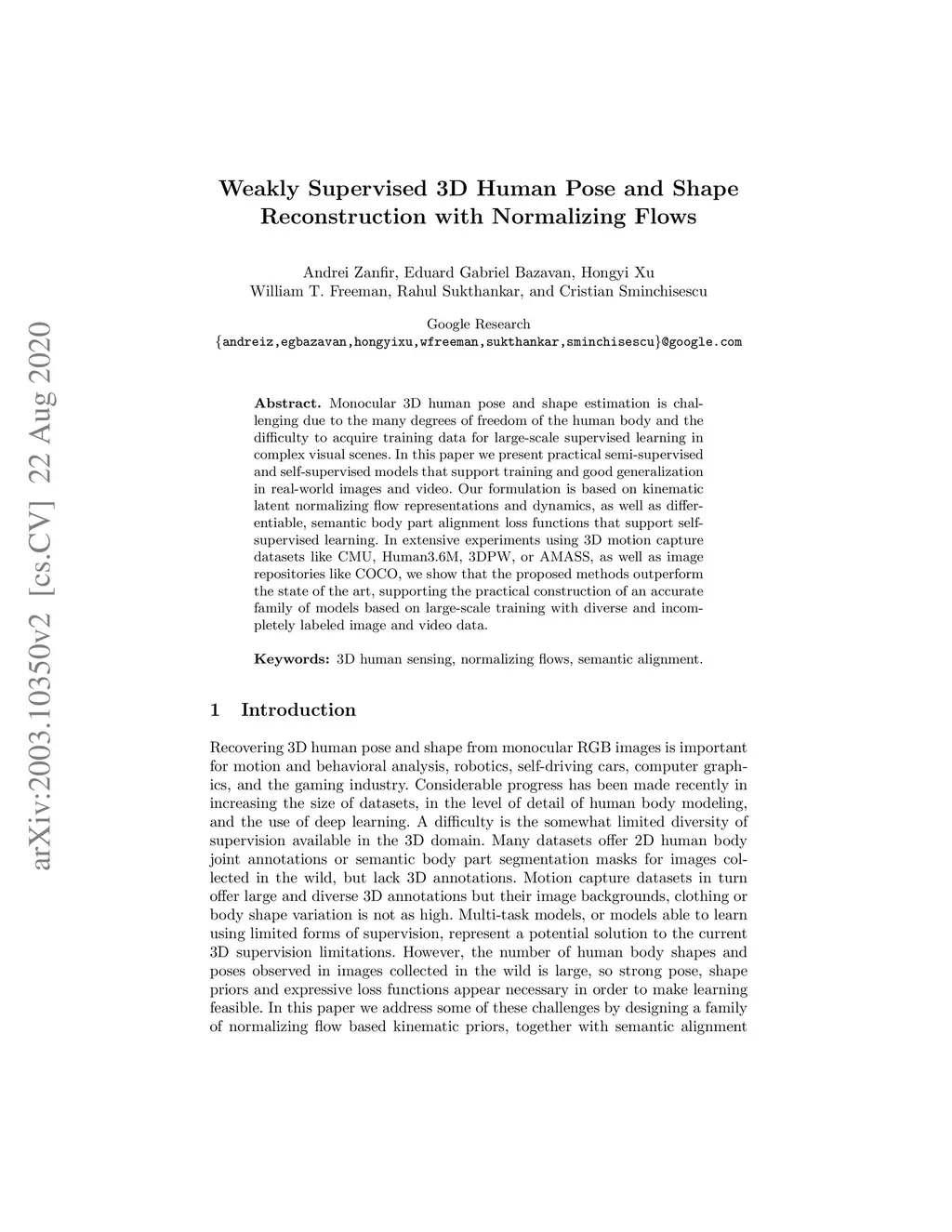 Monocular 3D human pose and shape estimation is challenging due to the many degrees of freedom of the human body and thedifficulty to acquire training data for large-scale supervised learning in complex visual scenes. In this paper we present practical semi-supervised and self-supervised models that support training and good generalization in real-world images and video. Our formulation is based on kinematic latent normalizing flow representations and dynamics, as well as differentiable, semantic body part alignment loss functions that support self-supervised learning. In extensive experiments using 3D motion capture datasets like CMU, Human3.6M, 3DPW, or AMASS, as well as image repositories like COCO, we show that the proposed methods outperform the state of the art, supporting the practical construction of an accurate family of models based on large-scale training with diverse and incompletely labeled image and video data.