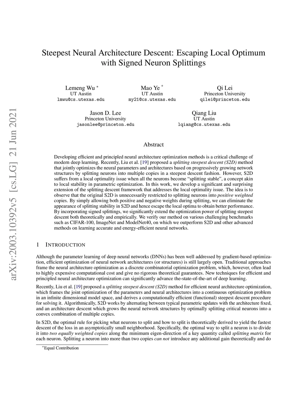 We propose signed splitting steepest descent (S3D), which progressively grows neural architectures by splitting critical neurons into multiple copies, following a theoretically-derived optimal scheme. Our algorithm is a generalization of the splitting steepest descent (S2D) of Liu et al. (2019b), but significantly improves over it by incorporating a rich set of new splitting schemes that allow negative output weights. By doing so, we can escape local optima that the original S2D can not escape. Theoretically, we show that our method provably learns neural networks with much smaller sizes than these needed for standard gradient descent in overparameterized regimes. Empirically, our method outperforms S2D and prior arts on various challenging benchmarks, including CIFAR-100, ImageNet and ModelNet40.