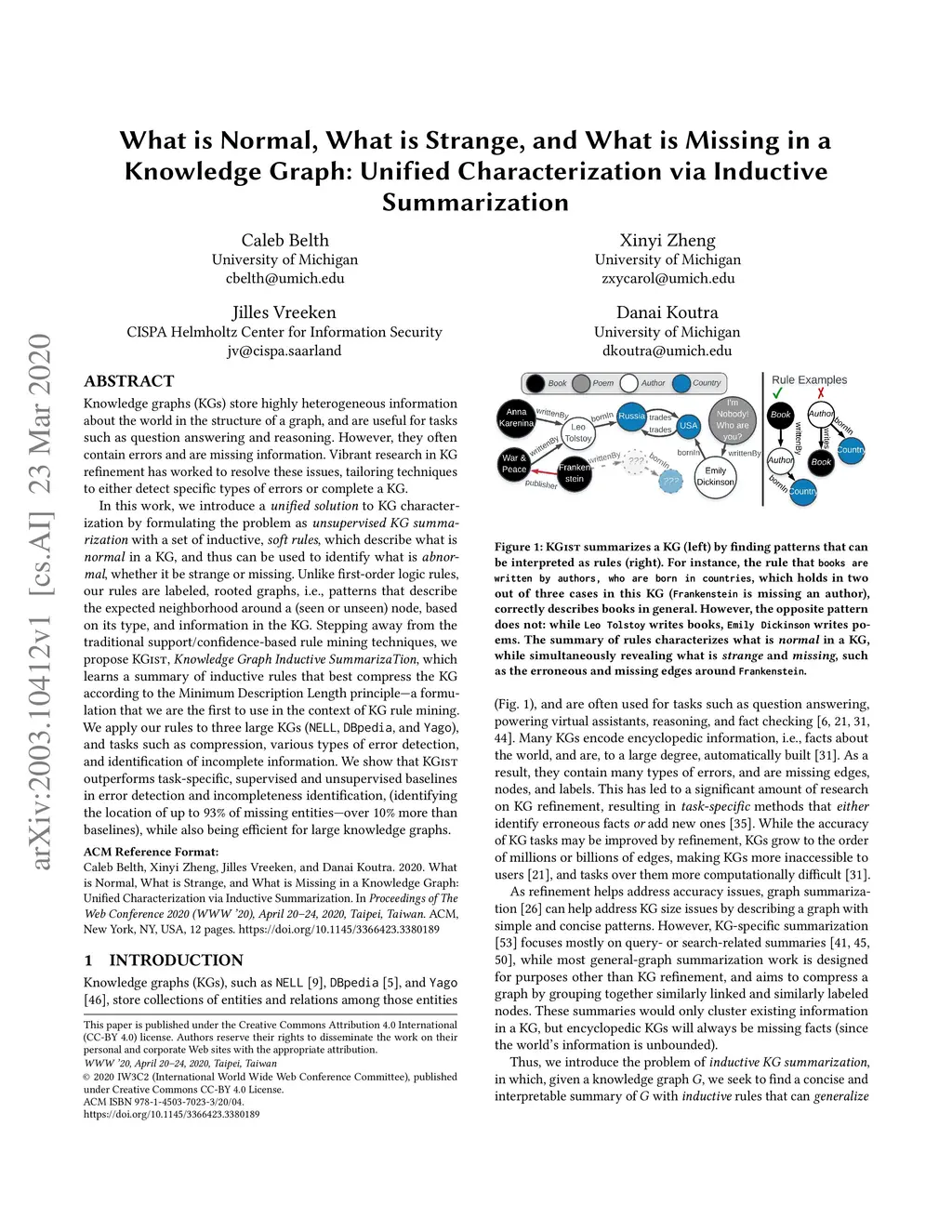 Knowledge graphs (KGs) store highly heterogeneous information about the world in the structure of a graph, and are useful for tasks such as question answering and reasoning. However, they often contain errors and are missing information. Vibrant research in KG refinement has worked to resolve these issues, tailoring techniques to either detect specific types of errors or complete a KG. In this work, we introduce a unified solution to KG characterization by formulating the problem as unsupervised KG summarization with a set of inductive, soft rules, which describe what is normal in a KG, and thus can be used to identify what is abnormal, whether it be strange or missing. Unlike first-order logic rules, our rules are labeled, rooted graphs, i.e., patterns that describe the expected neighborhood around a (seen or unseen) node, based on its type, and information in the KG. Stepping away from the traditional support/confidence-based rule mining techniques, we propose KGist, Knowledge Graph Inductive SummarizaTion, which learns a summary of inductive rules that best compress the KG according to the Minimum Description Length principle---a formulation that we are the first to use in the context of KG rule mining. We apply our rules to three large KGs (NELL, DBpedia, and Yago), and tasks such as compression, various types of error detection, and identification of incomplete information. We show that KGist outperforms task-specific, supervised and unsupervised baselines in error detection and incompleteness identification, (identifying the location of up to 93% of missing entities---over 10% more than baselines), while also being efficient for large knowledge graphs.