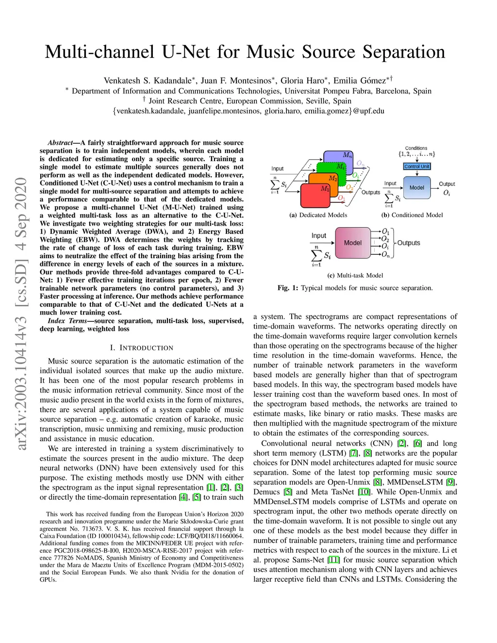 A fairly straightforward approach for music source separation is to train independent models, wherein each model is dedicated for estimating only a specific source. Training a single model to estimate multiple sources generally does not perform as well as the independent dedicated models. However, Conditioned U-Net (C-U-Net) uses a control mechanism to train a single model for multi-source separation and attempts to achieve a performance comparable to that of the dedicated models. We propose a multi-channel U-Net (M-U-Net) trained using a weighted multi-task loss as an alternative to the C-U-Net. We investigate two weighting strategies for our multi-task loss: 1) Dynamic Weighted Average (DWA), and 2) Energy Based Weighting (EBW). DWA determines the weights by tracking the rate of change of loss of each task during training. EBW aims to neutralize the effect of the training bias arising from the difference in energy levels of each of the sources in a mixture. Our methods provide three-fold advantages compared to C-UNet: 1) Fewer effective training iterations per epoch, 2) Fewer trainable network parameters (no control parameters), and 3) Faster processing at inference. Our methods achieve performance comparable to that of C-U-Net and the dedicated U-Nets at a much lower training cost.