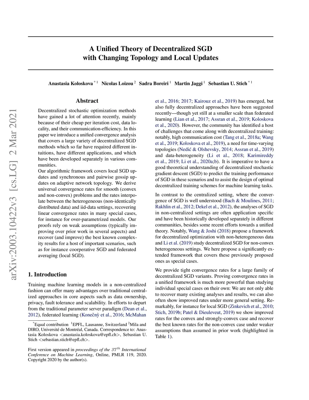 Decentralized stochastic optimization methods have gained a lot of attention recently, mainly because of their cheap per iteration cost, data locality, and their communication-efficiency. In this paper we introduce a unified convergence analysis that covers a large variety of decentralized SGD methods which so far have required different intuitions, have different applications, and which have been developed separately in various communities. Our algorithmic framework covers local SGD updates and synchronous and pairwise gossip updates on adaptive network topology. We derive universal convergence rates for smooth (convex and non-convex) problems and the rates interpolate between the heterogeneous (non-identically distributed data) and iid-data settings, recovering linear convergence rates in many special cases, for instance for over-parametrized models. Our proofs rely on weak assumptions (typically improving over prior work in several aspects) and recover (and improve) the best known complexity results for a host of important scenarios, such as for instance coorperative SGD and federated averaging (local SGD).