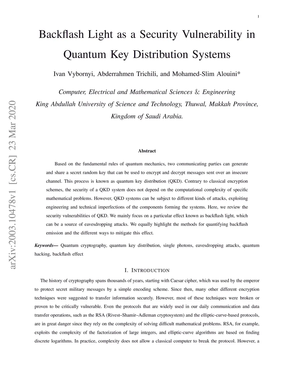 Based on the fundamental rules of quantum mechanics, two communicating parties can generate and share a secret random key that can be used to encrypt and decrypt messages sent over an insecure channel. This process is known as quantum key distribution (QKD). Contrary to classical encryption schemes, the security of a QKD system does not depend on the computational complexity of specific mathematical problems. However, QKD systems can be subject to different kinds of attacks, exploiting engineering and technical imperfections of the components forming the systems. Here, we review the security vulnerabilities of QKD. We mainly focus on a particular effect known as backflash light, which can be a source of eavesdropping attacks. We equally highlight the methods for quantifying backflash emission and the different ways to mitigate this effect.
