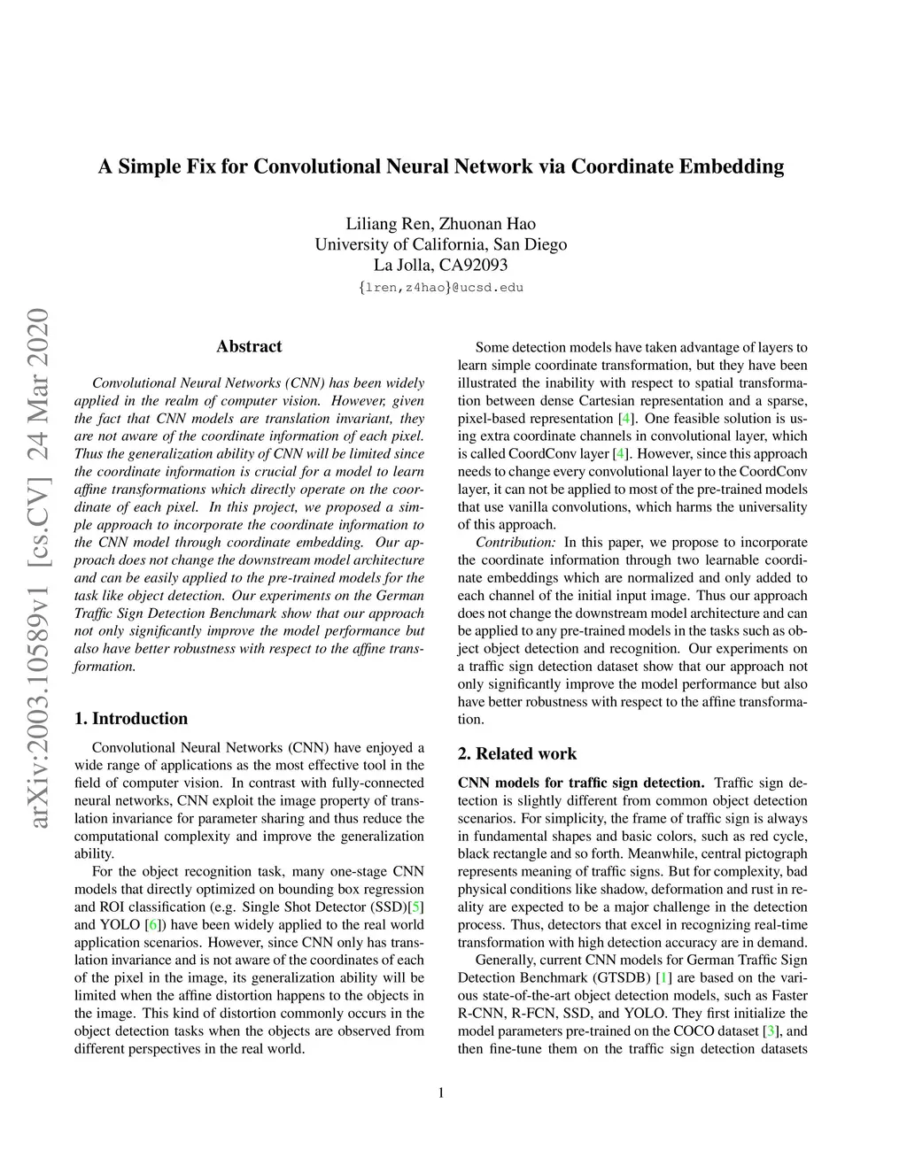 Convolutional Neural Networks (CNN) has been widely applied in the realm of computer vision. However, given the fact that CNN models are translation invariant, they are not aware of the coordinate information of each pixel. Thus the generalization ability of CNN will be limited since the coordinate information is crucial for a model to learn affine transformations which directly operate on the coordinate of each pixel. In this project, we proposed a simple approach to incorporate the coordinate information to the CNN model through coordinate embedding. Our approach does not change the downstream model architecture and can be easily applied to the pre-trained models for the task like object detection. Our experiments on the German Traffic Sign Detection Benchmark show that our approach not only significantly improve the model performance but also have better robustness with respect to the affine transformation.