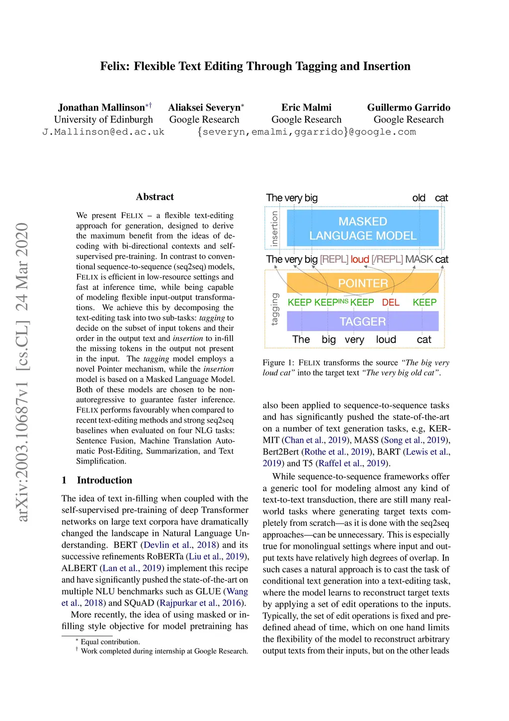 We present Felix --- a flexible text-editing approach for generation, designed to derive the maximum benefit from the ideas of decoding with bi-directional contexts and self-supervised pre-training. In contrast to conventional sequence-to-sequence (seq2seq) models, Felix is efficient in low-resource settings and fast at inference time, while being capable of modeling flexible input-output transformations. We achieve this by decomposing the text-editing task into two sub-tasks: tagging to decide on the subset of input tokens and their order in the output text and insertion to in-fill the missing tokens in the output not present in the input. The tagging model employs a novel Pointer mechanism, while the insertion model is based on a Masked Language Model. Both of these models are chosen to be non-autoregressive to guarantee faster inference. Felix performs favourably when compared to recent text-editing methods and strong seq2seq baselines when evaluated on four NLG tasks: Sentence Fusion, Machine Translation Automatic Post-Editing, Summarization, and Text Simplification.