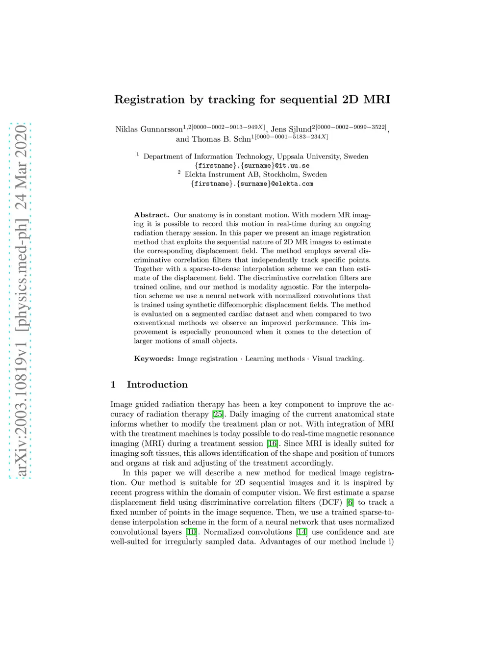 Our anatomy is in constant motion. With modern MR imaging it is possible to record this motion in real-time during an ongoing radiation therapy session. In this paper we present an image registration method that exploits the sequential nature of 2D MR images to estimate the corresponding displacement field. The method employs several discriminative correlation filters that independently track specific points. Together with a sparse-to-dense interpolation scheme we can then estimate of the displacement field. The discriminative correlation filters are trained online, and our method is modality agnostic. For the interpolation scheme we use a neural network with normalized convolutions that is trained using synthetic diffeomorphic displacement fields. The method is evaluated on a segmented cardiac dataset and when compared to two conventional methods we observe an improved performance. This improvement is especially pronounced when it comes to the detection of larger motions of small objects.