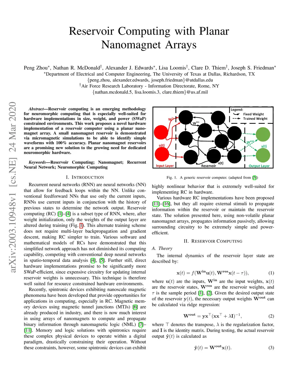 Reservoir computing is an emerging methodology for neuromorphic computing that is especially well-suited for hardware implementations in size, weight, and power (SWaP) constrained environments. This work proposes a novel hardware implementation of a reservoir computer using a planar nanomagnet array. A small nanomagnet reservoir is demonstrated via micromagnetic simulations to be able to identify simple waveforms with 100% accuracy. Planar nanomagnet reservoirs are a promising new solution to the growing need for dedicated neuromorphic hardware.
