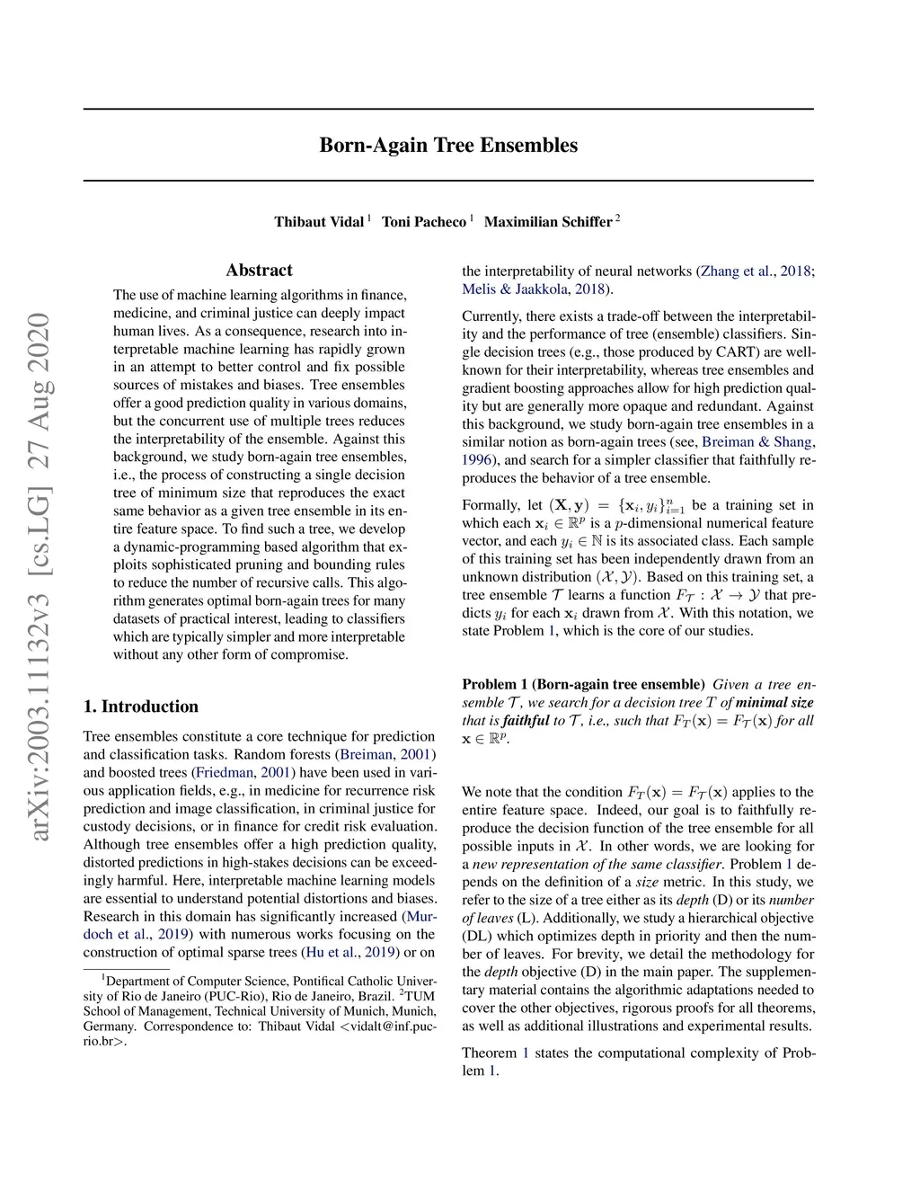 The use of machine learning algorithms in finance, medicine, and criminal justice can deeply impact human lives. As a consequence, research into interpretable machine learning has rapidly grown in an attempt to better control and fix possible sources of mistakes and biases. Tree ensembles offer a good prediction quality in various domains, but the concurrent use of multiple trees reduces the interpretability of the ensemble. Against this background, we study born-again tree ensembles, i.e., the process of constructing a single decision tree of minimum size that reproduces the exact same behavior as a given tree ensemble in its entire feature space. To find such a tree, we develop a dynamic-programming based algorithm that exploits sophisticated pruning and bounding rules to reduce the number of recursive calls. This algorithm generates optimal born-again trees for many datasets of practical interest, leading to classifiers which are typically simpler and more interpretable without any other form of compromise.