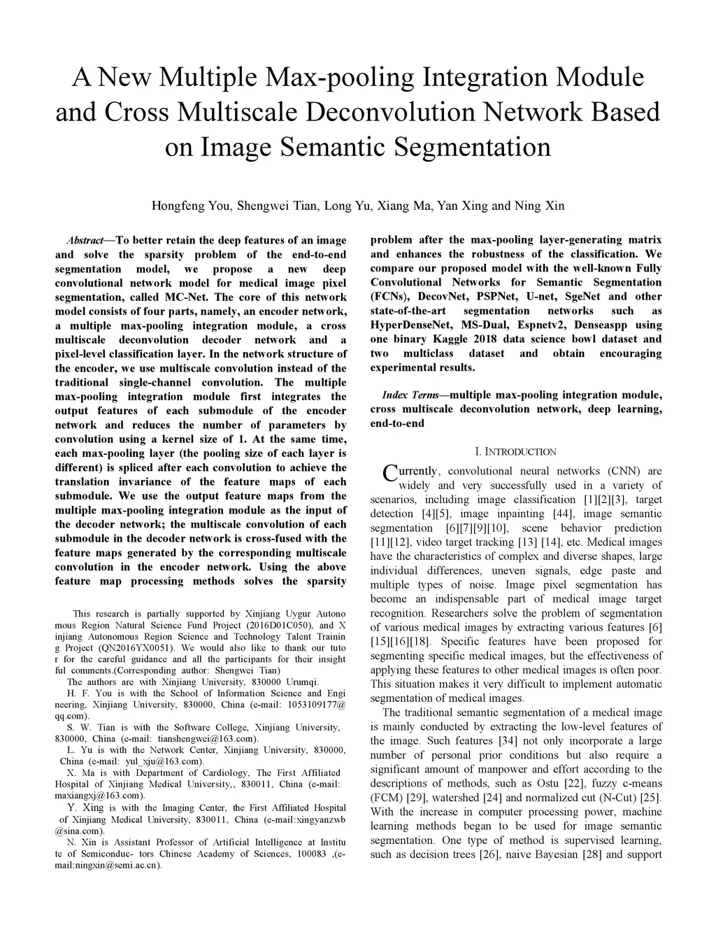To better retain the deep features of an image and solve the sparsity problem of the end-to-end segmentation model, we propose a new deep convolutional network model for medical image pixel segmentation, called MC-Net. The core of this network model consists of four parts, namely, an encoder network, a multiple max-pooling integration module, a cross multiscale deconvolution decoder network and a pixel-level classification layer. In the network structure of the encoder, we use multiscale convolution instead of the traditional single-channel convolution. The multiple max-pooling integration module first integrates the output features of each submodule of the encoder network and reduces the number of parameters by convolution using a kernel size of 1. At the same time, each max-pooling layer (the pooling size of each layer is different) is spliced after each convolution to achieve the translation invariance of the feature maps of each submodule. We use the output feature maps from the multiple max-pooling integration module as the input of the decoder network; the multiscale convolution of each submodule in the decoder network is cross-fused with the feature maps generated by the corresponding multiscale convolution in the encoder network. Using the above feature map processing methods solves the sparsity problem after the max-pooling layer-generating matrix and enhances the robustness of the classification. We compare our proposed model with the well-known Fully Convolutional Networks for Semantic Segmentation (FCNs), DecovNet, PSPNet, U-net, SgeNet and other state-of-the-art segmentation networks such as HyperDenseNet, MS-Dual, Espnetv2, Denseaspp using one binary Kaggle 2018 data science bowl dataset and two multiclass dataset and obtain encouraging experimental results.