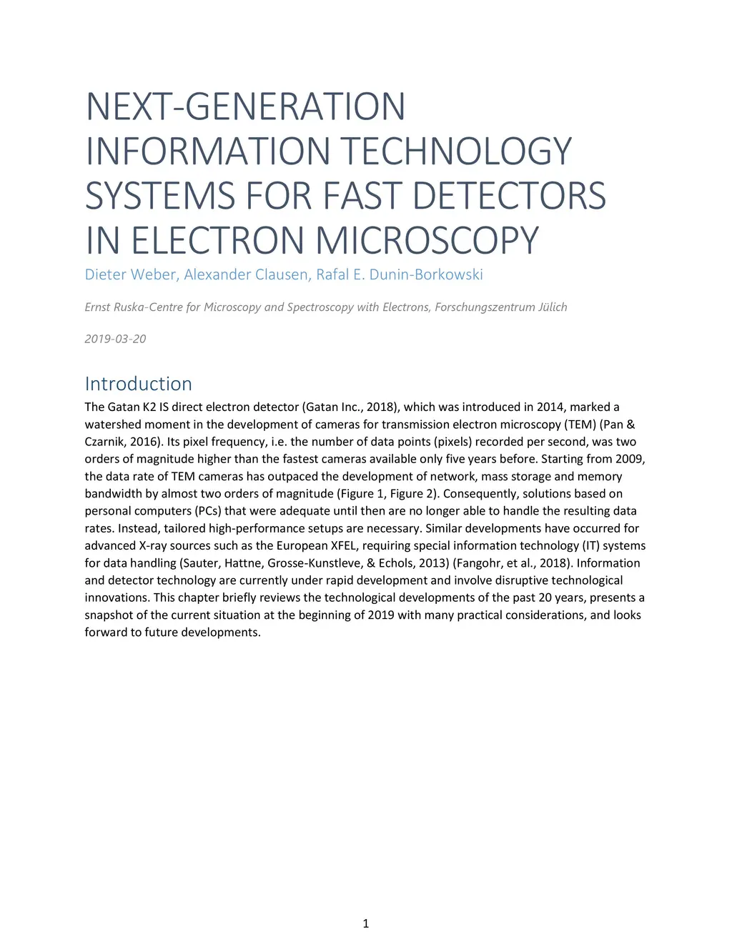 The Gatan K2 IS direct electron detector (Gatan Inc., 2018), which was introduced in 2014, marked a watershed moment in the development of cameras for transmission electron microscopy (TEM) (Pan & Czarnik, 2016). Its pixel frequency, i.e. the number of data points (pixels) recorded per second, was two orders of magnitude higher than the fastest cameras available only five years before. Starting from 2009, the data rate of TEM cameras has outpaced the development of network, mass storage and memory bandwidth by almost two orders of magnitude. Consequently, solutions based on personal computers (PCs) that were adequate until then are no longer able to handle the resulting data rates. Instead, tailored high-performance setups are necessary. Similar developments have occurred for advanced X-ray sources such as the European XFEL, requiring special information technology (IT) systems for data handling (Sauter, Hattne, Grosse-Kunstleve, & Echols, 2013) (Fangohr, et al., 2018). Information and detector technology are currently under rapid development and involve disruptive technological innovations. This chapter briefly reviews the technological developments of the past 20 years, presents a snapshot of the current situation at the beginning of 2019 with many practical considerations, and looks forward to future developments.
