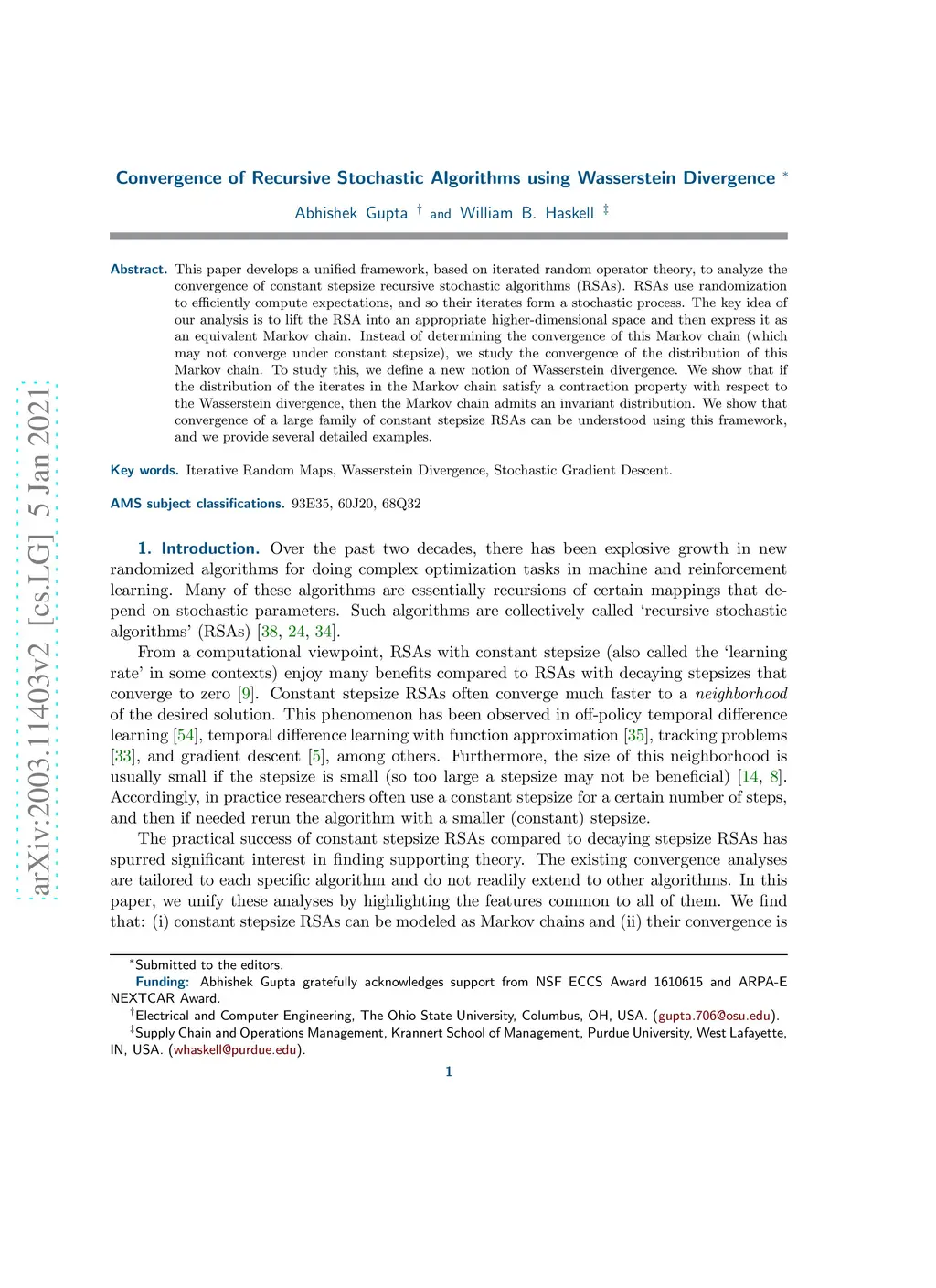 This paper develops a unified framework, based on iterated random operator theory, to analyze the convergence of constant stepsize recursive stochastic algorithms (RSAs). RSAs use randomization to efficiently compute expectations, and so their iterates form a stochastic process. The key idea of our analysis is to lift the RSA into an appropriate higher-dimensional space and then express it as an equivalent Markov chain. Instead of determining the convergence of this Markov chain (which may not converge under constant stepsize), we study the convergence of the distribution of this Markov chain. To study this, we define a new notion of Wasserstein divergence. We show that if the distribution of the iterates in the Markov chain satisfy a contraction property with respect to the Wasserstein divergence, then the Markov chain admits an invariant distribution. We show that convergence of a large family of constant stepsize RSAs can be understood using this framework, and we provide several detailed examples.
