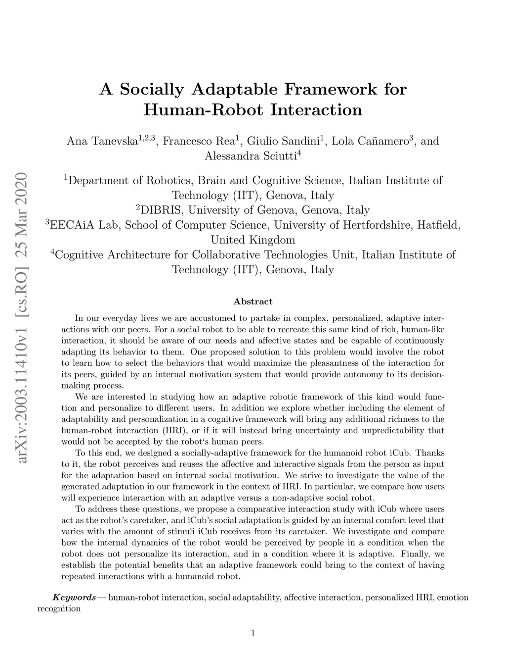 In our everyday lives we are accustomed to partake in complex, personalized, adaptive interactions with our peers. For a social robot to be able to recreate this same kind of rich, human-like interaction, it should be aware of our needs and affective states and be capable of continuously adapting its behavior to them. One proposed solution to this problem would involve the robot to learn how to select the behaviors that would maximize the pleasantness of the interaction for its peers, guided by an internal motivation system that would provide autonomy to its decision-making process. We are interested in studying how an adaptive robotic framework of this kind would function and personalize to different users. In addition we explore whether including the element of adaptability and personalization in a cognitive framework will bring any additional richness to the human-robot interaction (HRI), or if it will instead bring uncertainty and unpredictability that would not be accepted by the robot`s human peers. To this end, we designed a socially-adaptive framework for the humanoid robot iCub which allows it to perceive and reuse the affective and interactive signals from the person as input for the adaptation based on internal social motivation. We propose a comparative interaction study with iCub where users act as the robot's caretaker, and iCub's social adaptation is guided by an internal comfort level that varies with the amount of stimuli iCub receives from its caretaker. We investigate and compare how the internal dynamics of the robot would be perceived by people in a condition when the robot does not personalize its interaction, and in a condition where it is adaptive. Finally, we establish the potential benefits that an adaptive framework could bring to the context of having repeated interactions with a humanoid robot.