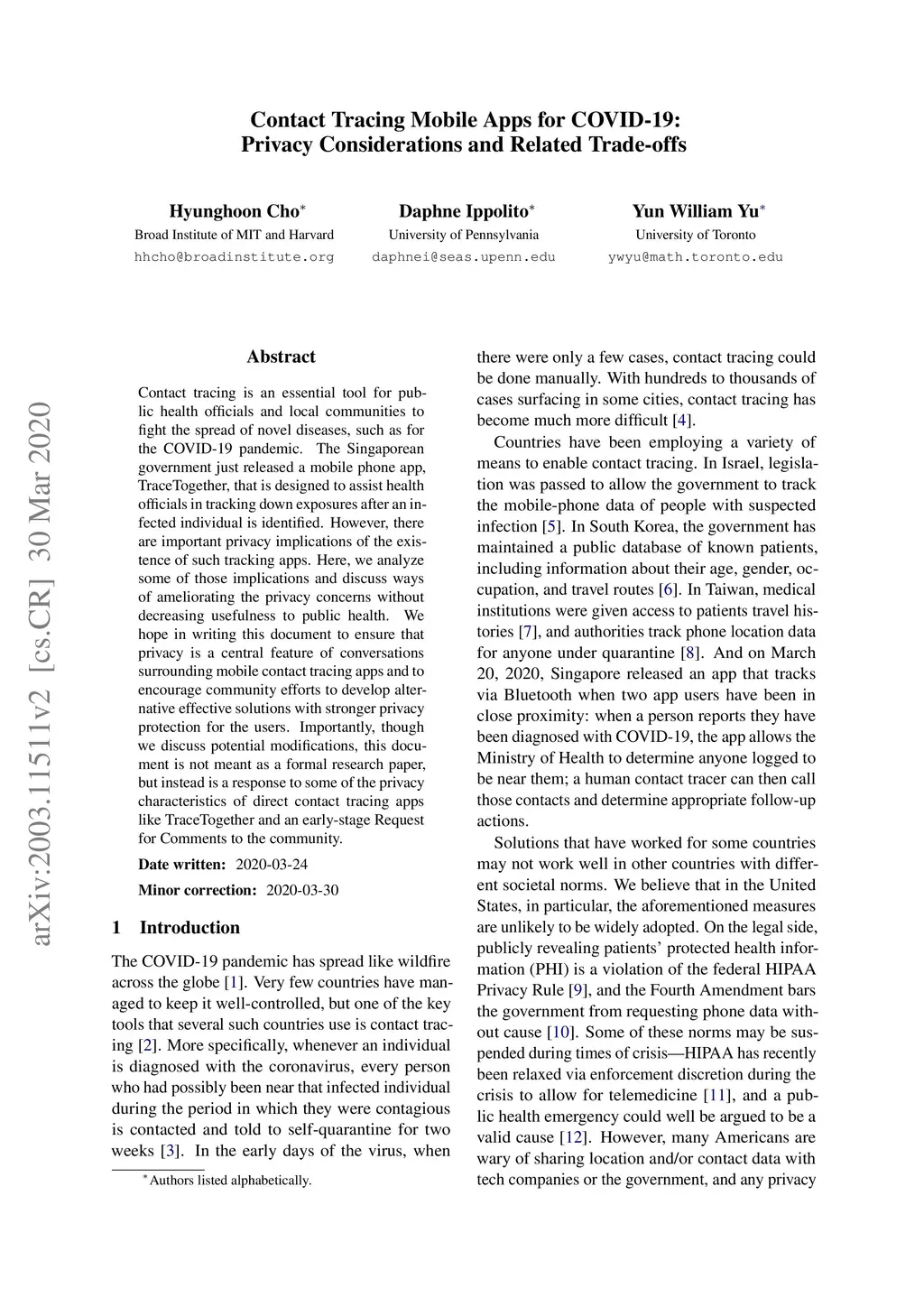 Contact tracing is an essential tool for public health officials and local communities to fight the spread of novel diseases, such as for the COVID-19 pandemic. The Singaporean government just released a mobile phone app, TraceTogether, that is designed to assist health officials in tracking down exposures after an infected individual is identified. However, there are important privacy implications of the existence of such tracking apps. Here, we analyze some of those implications and discuss ways of ameliorating the privacy concerns without decreasing usefulness to public health. We hope in writing this document to ensure that privacy is a central feature of conversations surrounding mobile contact tracing apps and to encourage community efforts to develop alternative effective solutions with stronger privacy protection for the users. Importantly, though we discuss potential modifications, this document is not meant as a formal research paper, but instead is a response to some of the privacy characteristics of direct contact tracing apps like TraceTogether and an early-stage Request for Comments to the community. Date written: 2020-03-24 Minor correction: 2020-03-30