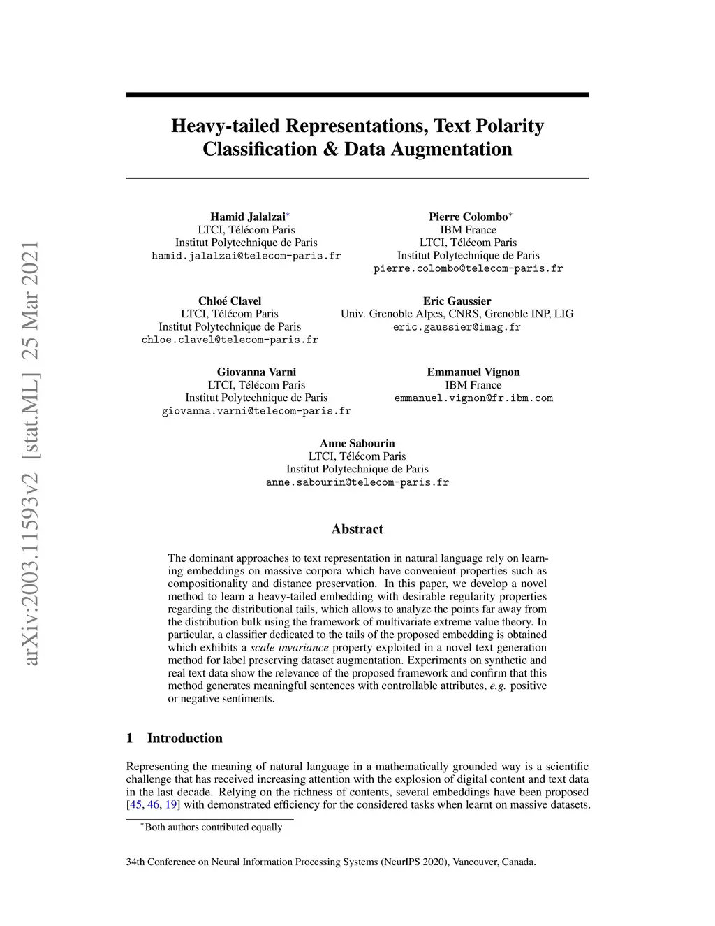 The dominant approaches to text representation in natural language rely on learning embeddings on massive corpora which have convenient properties such as compositionality and distance preservation. In this paper, we develop a novel method to learn a heavy-tailed embedding with desirable regularity properties regarding the distributional tails, which allows to analyze the points far away from the distribution bulk using the framework of multivariate extreme value theory. In particular, a classifier dedicated to the tails of the proposed embedding is obtained which performance outperforms the baseline. This classifier exhibits a scale invariance property which we leverage by introducing a novel text generation method for label preserving dataset augmentation. Numerical experiments on synthetic and real text data demonstrate the relevance of the proposed framework and confirm that this method generates meaningful sentences with controllable attribute, e.g. positive or negative sentiment.