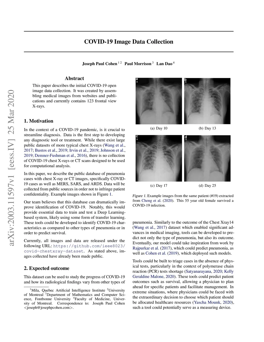 This paper describes the initial COVID-19 open image data collection. It was created by assembling medical images from websites and publications and currently contains 123 frontal view X-rays.