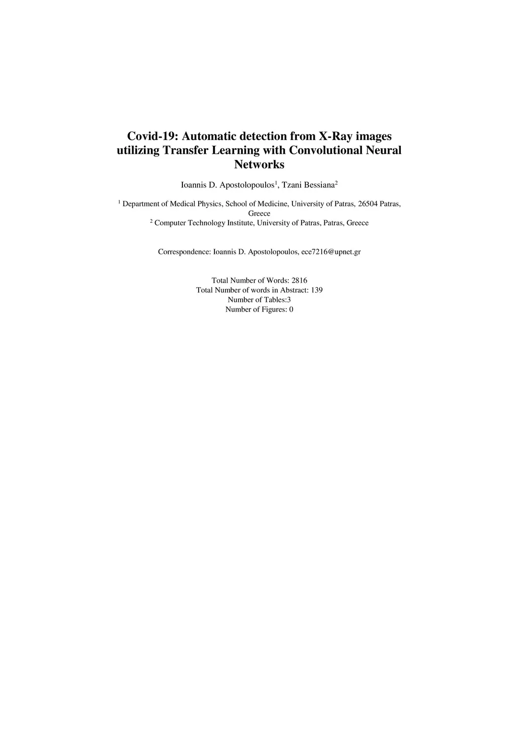Covid-19: Automatic detection from X-Ray images utilizing Transfer