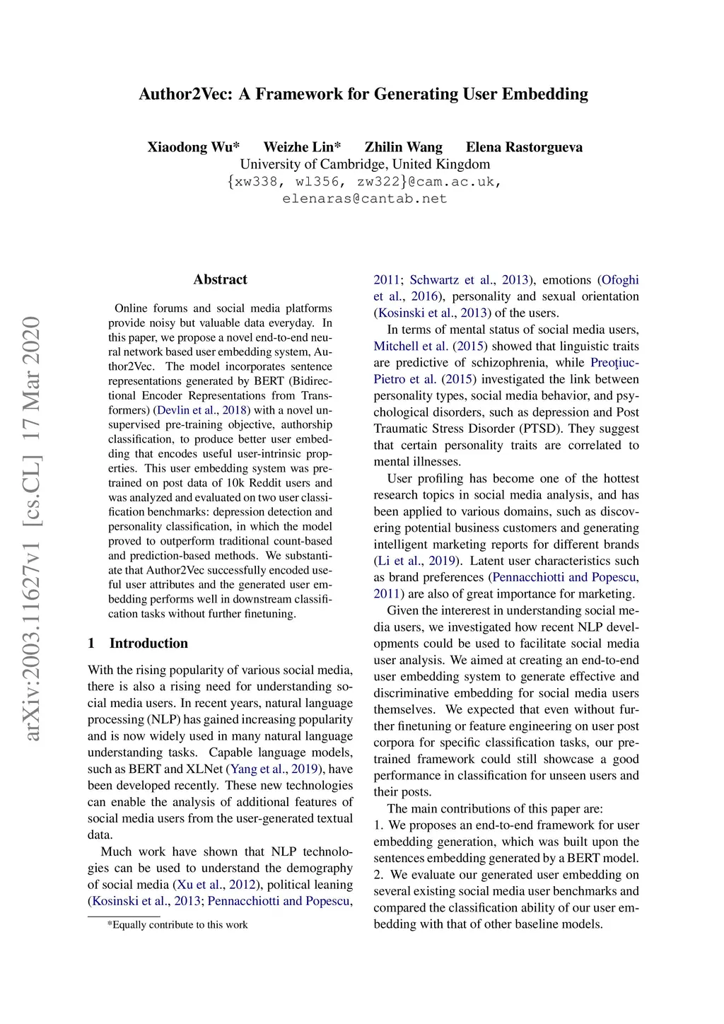 Online forums and social media platforms provide noisy but valuable data every day. In this paper, we propose a novel end-to-end neural network-based user embedding system, Author2Vec. The model incorporates sentence representations generated by BERT (Bidirectional Encoder Representations from Transformers) with a novel unsupervised pre-training objective, authorship classification, to produce better user embedding that encodes useful user-intrinsic properties. This user embedding system was pre-trained on post data of 10k Reddit users and was analyzed and evaluated on two user classification benchmarks: depression detection and personality classification, in which the model proved to outperform traditional count-based and prediction-based methods. We substantiate that Author2Vec successfully encoded useful user attributes and the generated user embedding performs well in downstream classification tasks without further finetuning.