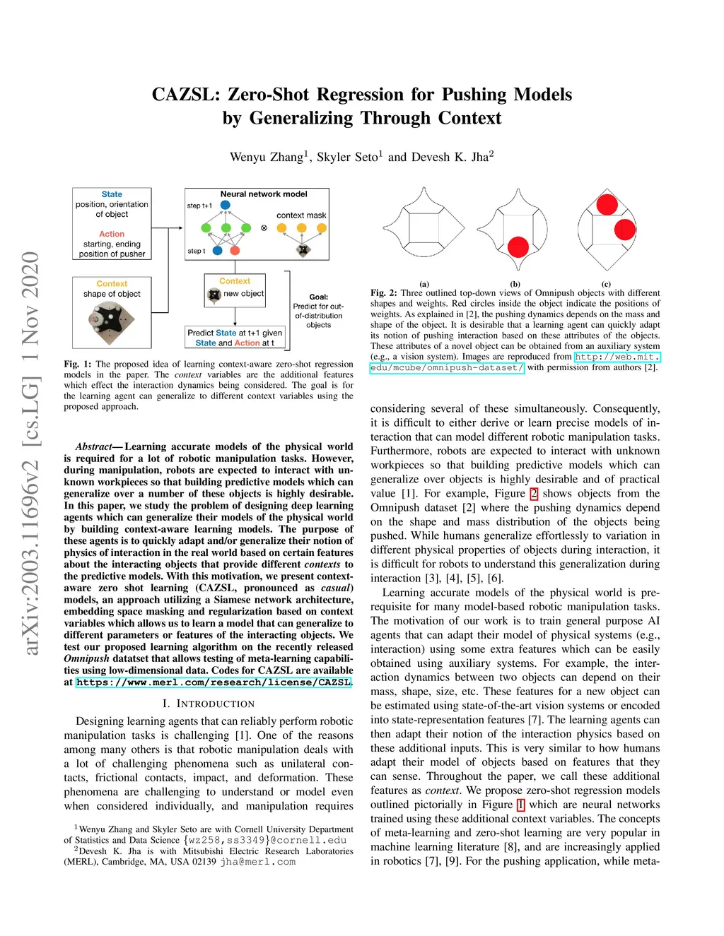 Learning accurate models of the physical world is required for a lot of robotic manipulation tasks. However, during manipulation, robots are expected to interact with unknown workpieces so that building predictive models which can generalize over a number of these objects is highly desirable. In this paper, we study the problem of designing learning agents which can generalize their models of the physical world by building context-aware learning models. The purpose of these agents is to quickly adapt and/or generalize their notion of physics of interaction in the real world based on certain features about the interacting objects that provide different contexts to the predictive models. With this motivation, we present context-aware zero shot learning (CAZSL, pronounced as 'casual') models, an approach utilizing a Siamese network architecture, embedding space masking and regularization based on context variables which allows us to learn a model that can generalize to different parameters or features of the interacting objects. We test our proposed learning algorithm on the recently released Omnipush datatset that allows testing of meta-learning capabilities using low-dimensional data.