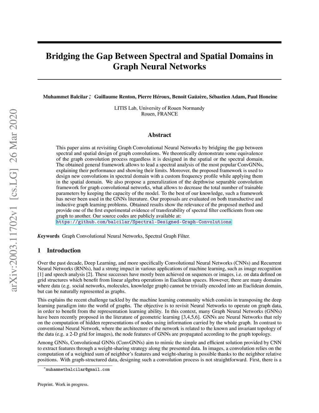 This paper aims at revisiting Graph Convolutional Neural Networks by bridging the gap between spectral and spatial design of graph convolutions. We theoretically demonstrate some equivalence of the graph convolution process regardless it is designed in the spatial or the spectral domain. The obtained general framework allows to lead a spectral analysis of the most popular ConvGNNs, explaining their performance and showing their limits. Moreover, the proposed framework is used to design new convolutions in spectral domain with a custom frequency profile while applying them in the spatial domain. We also propose a generalization of the depthwise separable convolution framework for graph convolutional networks, what allows to decrease the total number of trainable parameters by keeping the capacity of the model. To the best of our knowledge, such a framework has never been used in the GNNs literature. Our proposals are evaluated on both transductive and inductive graph learning problems. Obtained results show the relevance of the proposed method and provide one of the first experimental evidence of transferability of spectral filter coefficients from one graph to another. Our source codes are publicly available at: https://github.com/balcilar/Spectral-Designed-Graph-Convolutions