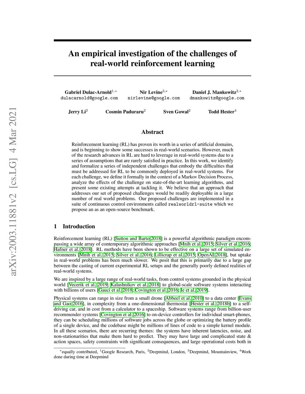 Reinforcement learning (RL) has proven its worth in a series of artificial domains, and is beginning to show some successes in real-world scenarios. However, much of the research advances in RL are hard to leverage in real-world systems due to a series of assumptions that are rarely satisfied in practice. In this work, we identify and formalize a series of independent challenges that embody the difficulties that must be addressed for RL to be commonly deployed in real-world systems. For each challenge, we define it formally in the context of a Markov Decision Process, analyze the effects of the challenge on state-of-the-art learning algorithms, and present some existing attempts at tackling it. We believe that an approach that addresses our set of proposed challenges would be readily deployable in a large number of real world problems. Our proposed challenges are implemented in a suite of continuous control environments called the realworldrl-suite which we propose an as an open-source benchmark.