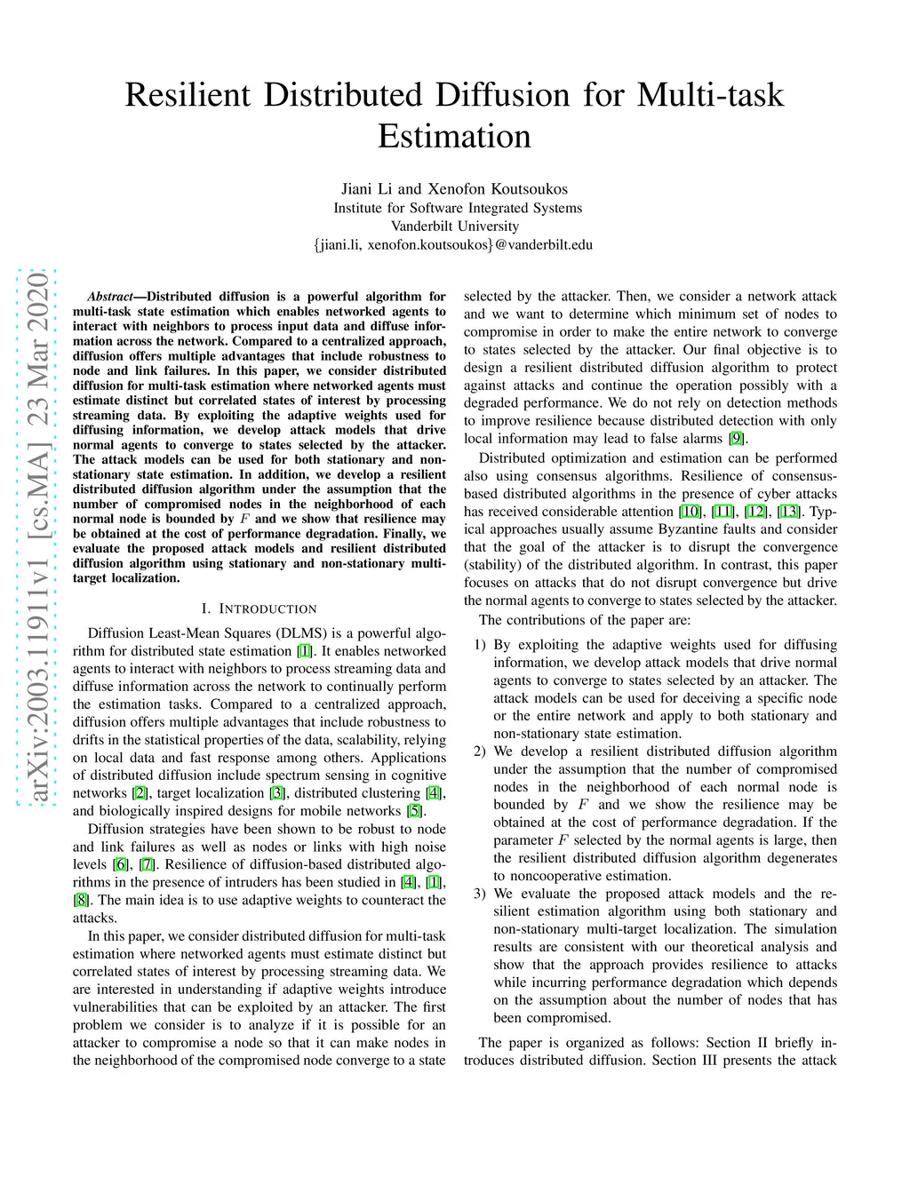 Distributed diffusion is a powerful algorithm for multi-task state estimation which enables networked agents to interact with neighbors to process input data and diffuse information across the network. Compared to a centralized approach, diffusion offers multiple advantages that include robustness to node and link failures. In this paper, we consider distributed diffusion for multi-task estimation where networked agents must estimate distinct but correlated states of interest by processing streaming data. By exploiting the adaptive weights used for diffusing information, we develop attack models that drive normal agents to converge to states selected by the attacker. The attack models can be used for both stationary and non-stationary state estimation. In addition, we develop a resilient distributed diffusion algorithm under the assumption that the number of compromised nodes in the neighborhood of each normal node is bounded by and we show that resilience may be obtained at the cost of performance degradation. Finally, we evaluate the proposed attack models and resilient distributed diffusion algorithm using stationary and non-stationary multi-target localization.