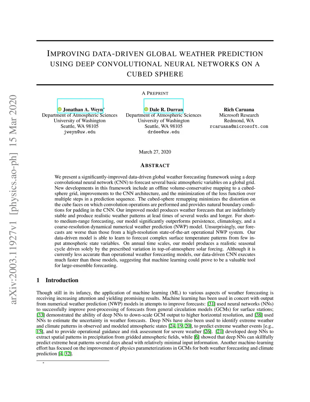 Improving data-driven global weather prediction using deep convolutional