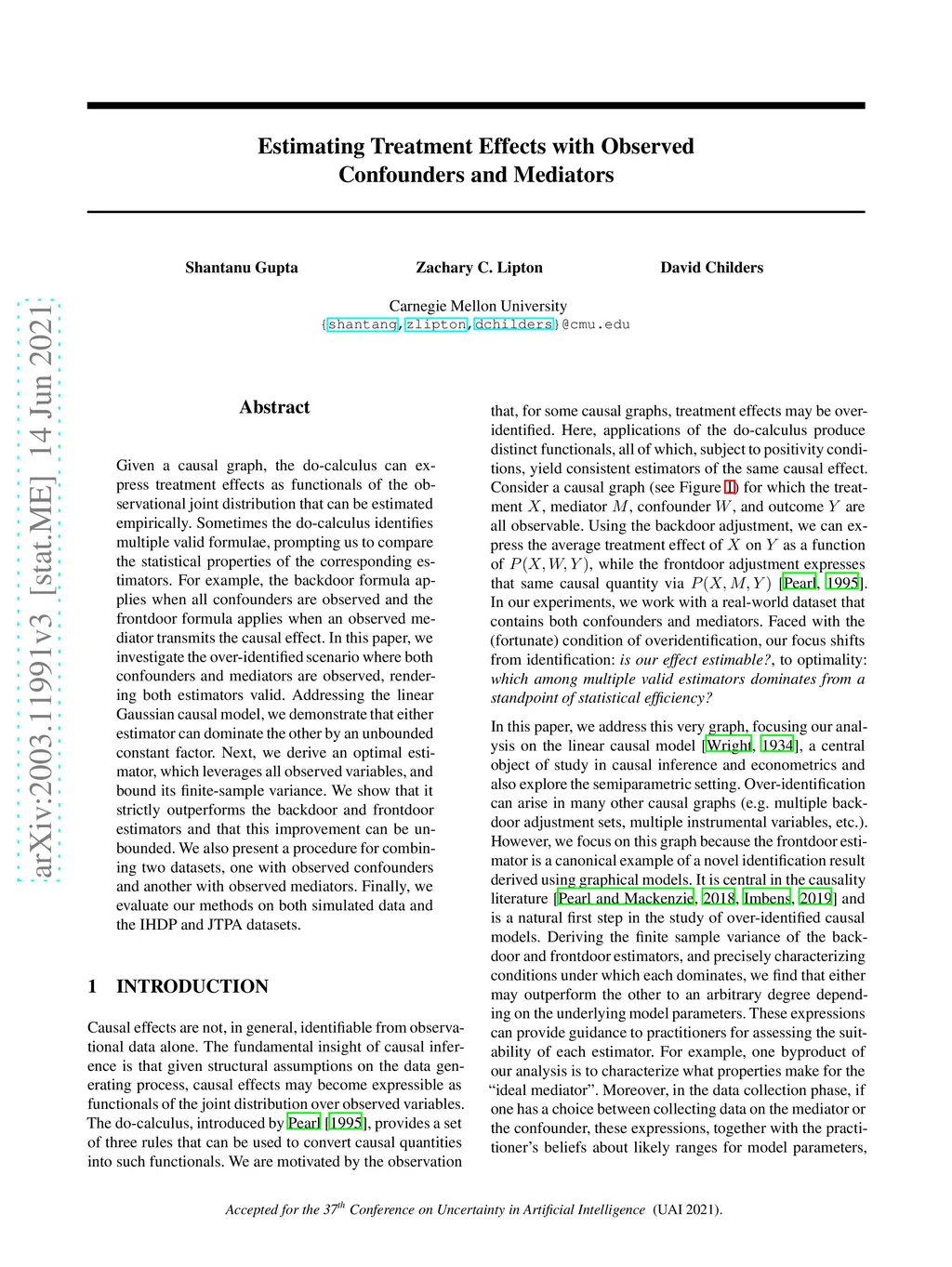 Given a causal graph, the do-calculus can express treatment effects as functionals of the observational joint distribution that can be estimated empirically. Sometimes the do-calculus identifies multiple valid formulae, prompting us to compare the statistical properties of the corresponding estimators. For example, the backdoor formula applies when all confounders are observed and the frontdoor formula applies when an observed mediator transmits the causal effect. In this paper, we investigate the over-identified scenario where both confounders and mediators are observed, rendering both estimators valid. Addressing the linear Gaussian causal model, we derive the finite-sample variance for both estimators and demonstrate that either estimator can dominate the other by an unbounded constant factor depending on the model parameters. Next, we derive an optimal estimator, which leverages all observed variables to strictly outperform the backdoor and frontdoor estimators. We also present a procedure for combining two datasets, with confounders observed in one and mediators in the other. Finally, we evaluate our methods on both simulated data and the IHDP and JTPA datasets.