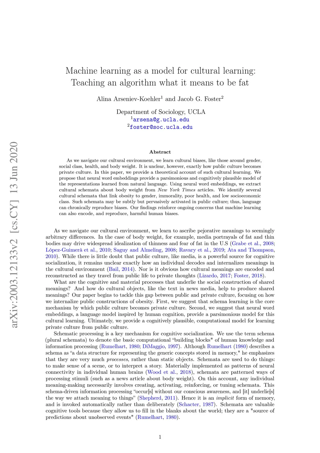 As we navigate our cultural environment, we learn cultural biases, like those around gender, social class, health, and body weight. It is unclear, however, exactly how public culture becomes private culture. In this paper, we provide a theoretical account of such cultural learning. We propose that neural word embeddings provide a parsimonious and cognitively plausible model of the representations learned from natural language. Using neural word embeddings, we extract cultural schemata about body weight from New York Times articles. We identify several cultural schemata that link obesity to gender, immorality, poor health, and low socioeconomic class. Such schemata may be subtly but pervasively activated in public culture; thus, language can chronically reproduce biases. Our findings reinforce ongoing concerns that machine learning can also encode, and reproduce, harmful human biases.