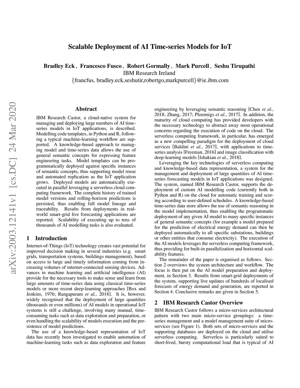 IBM Research Castor, a cloud-native system for managing and deploying large numbers of AI time-series models in IoT applications, is described. Modelling code templates, in Python and R, following a typical machine-learning workflow are supported. A knowledge-based approach to managing model and time-series data allows the use of general semantic concepts for expressing feature engineering tasks. Model templates can be programmatically deployed against specific instances of semantic concepts, thus supporting model reuse and automated replication as the IoT application grows. Deployed models are automatically executed in parallel leveraging a serverless cloud computing framework. The complete history of trained model versions and rolling-horizon predictions is persisted, thus enabling full model lineage and traceability. Results from deployments in real-world smart-grid live forecasting applications are reported. Scalability of executing up to tens of thousands of AI modelling tasks is also evaluated.