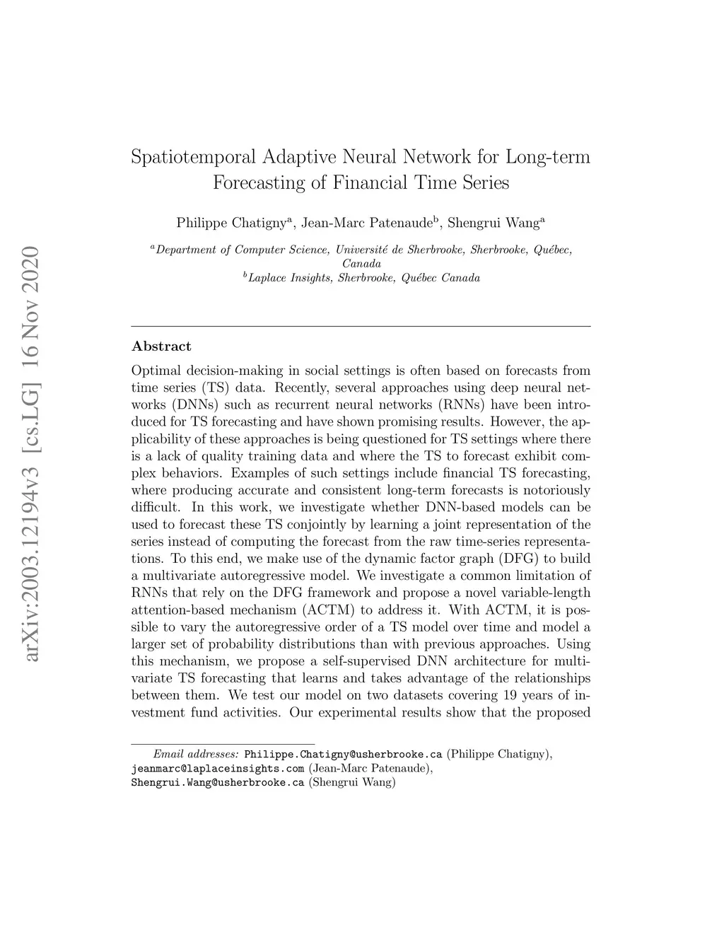 Optimal decision-making in social settings is often based on forecasts from time series (TS) data. Recently, several approaches using deep neural networks (DNNs) such as recurrent neural networks (RNNs) have been introduced for TS forecasting and have shown promising results. However, the applicability of these approaches is being questioned for TS settings where there is a lack of quality training data and where the TS to forecast exhibit complex behaviors. Examples of such settings include financial TS forecasting, where producing accurate and consistent long-term forecasts is notoriously difficult. In this work, we investigate whether DNN-based models can be used to forecast these TS conjointly by learning a joint representation of the series instead of computing the forecast from the raw time-series representations. To this end, we make use of the dynamic factor graph (DFG) to build a multivariate autoregressive model. We investigate a common limitation of RNNs that rely on the DFG framework and propose a novel variable-length attention-based mechanism (ACTM) to address it. With ACTM, it is possible to vary the autoregressive order of a TS model over time and model a larger set of probability distributions than with previous approaches. Using this mechanism, we propose a self-supervised DNN architecture for multivariate TS forecasting that learns and takes advantage of the relationships between them. We test our model on two datasets covering 19 years of investment fund activities. Our experimental results show that the proposed approach significantly outperforms typical DNN-based and statistical models at forecasting the 21-day price trajectory. We point out how improving forecasting accuracy and knowing which forecaster to use can improve the excess return of autonomous trading strategies.