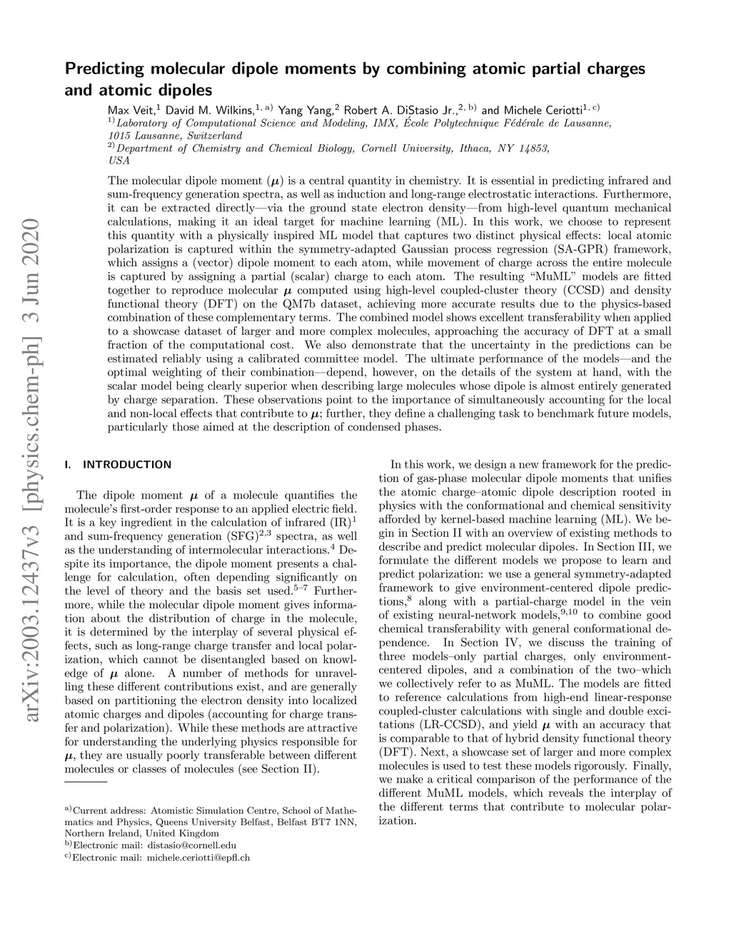 The molecular dipole moment is a central quantity in chemistry. It is essential in predicting infrared spectra, sum-frequency generation spectra, and long-range electrostatic interactions. Furthermore, it can be extracted directly -- via the ground state electron density -- from high-level quantum mechanical calculations, making it an ideal target for machine learning. We choose to represent this quantity with a physically-inspired ML model that captures two distinct physical effects: local atomic polarization is captured within the symmetry-adapted Gaussian process regression (SA-GPR) framework, which assigns a (vector) dipole moment to each atom, while movement of charge across the entire molecule is captured by assigning a partial (scalar) charge to each atom. These "MuML" models are fitted together to reproduce molecular dipole moments computed by high-level coupled-cluster theory (CCSD) on the QM7b dataset, achieving more accurate results due to the physics-inspired combination of these complementary terms. The combined model shows excellent transferability to a showcase dataset of larger molecules, approaching the accuracy of DFT at a small fraction of the computational cost. The ultimate performance -- and the optimal weighting of their combination -- depend, however, on the details of the system at hand, with the scalar model being clearly superior when describing large molecules whose dipole is almost entirely generated by charge separation. These observations point to the importance of simultaneously accounting for the local and non-local effects that contribute to the molecular dipole moment; further, they define a challenging task to benchmark future models, particularly those aimed at the description of condensed phases.