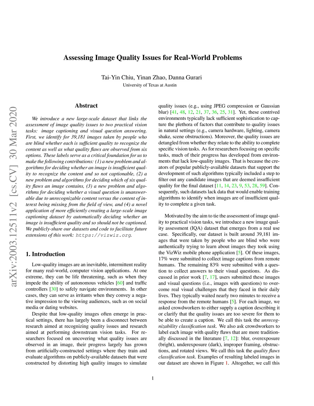We introduce a new large-scale dataset that links the assessment of image quality issues to two practical vision tasks: image captioning and visual question answering. First, we identify for 39,181 images taken by people who are blind whether each is sufficient quality to recognize the content as well as what quality flaws are observed from six options. These labels serve as a critical foundation for us to make the following contributions: (1) a new problem and algorithms for deciding whether an image is insufficient quality to recognize the content and so not captionable, (2) a new problem and algorithms for deciding which of six quality flaws an image contains, (3) a new problem and algorithms for deciding whether a visual question is unanswerable due to unrecognizable content versus the content of interest being missing from the field of view, and (4) a novel application of more efficiently creating a large-scale image captioning dataset by automatically deciding whether an image is insufficient quality and so should not be captioned. We publicly-share our datasets and code to facilitate future extensions of this work: https://vizwiz.org.