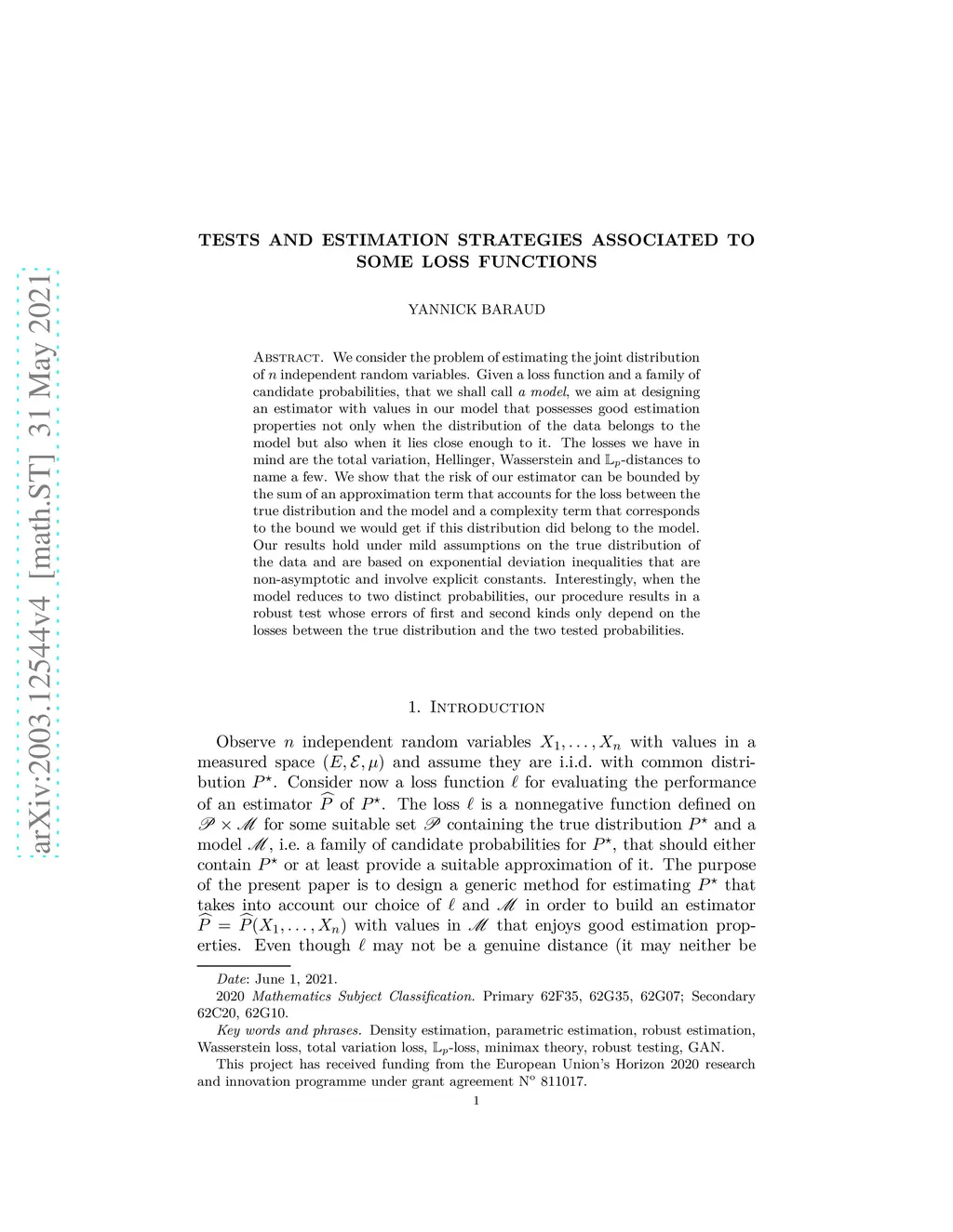 We consider the problem of estimating the joint distribution of independent random variables. Our approach is based on a family of candidate probabilities that we shall call a model and which is chosen to either contain the true distribution of the data or at least to provide a good approximation of it with respect to some loss function. The aim of the present paper is to describe a general estimation strategy that allows to adapt to both the specific features of the model and the choice of the loss function in view of designing an estimator with good estimation properties. The losses we have in mind are based on the total variation, Hellinger, Wasserstein and -distances to name a few. We show that the risk of the resulting estimator with respect to the loss function can be bounded by the sum of an approximation term accounting for the loss between the true distribution and the model and a complexity term that corresponds to the bound we would get if this distribution did belong to the model. Our results hold under mild assumptions on the true distribution of the data and are based on exponential deviation inequalities that are non-asymptotic and involve explicit constants. When the model reduces to two distinct probabilities, we show how our estimation strategy leads to a robust test whose errors of first and second kinds only depend on the losses between the true distribution and the two tested probabilities.