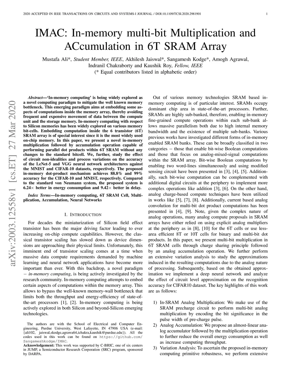 IMAC: In-memory multi-bit Multiplication andACcumulation in 6T SRAM