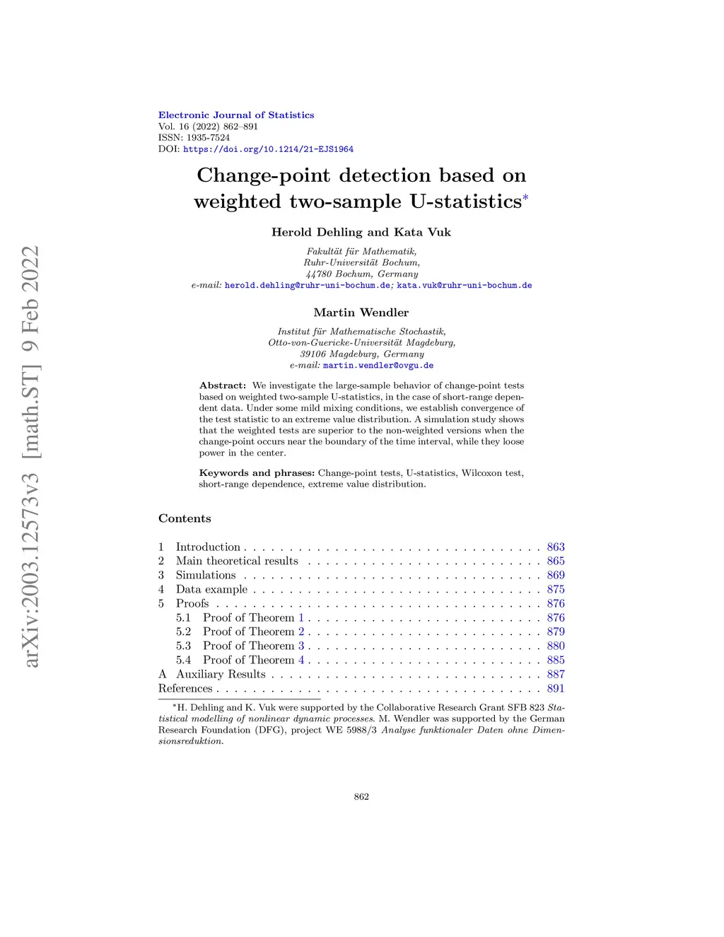 We investigate the large-sample behavior of change-point tests based on weighted two-sample U-statistics, in the case of short-range dependent data. Under some mild mixing conditions, we establish convergence of the test statistic to an extreme value distribution. A simulation study shows that the weighted tests are superior to the non-weighted versions when the change-point occurs near the boundary of the time interval, while they loose power in the center.