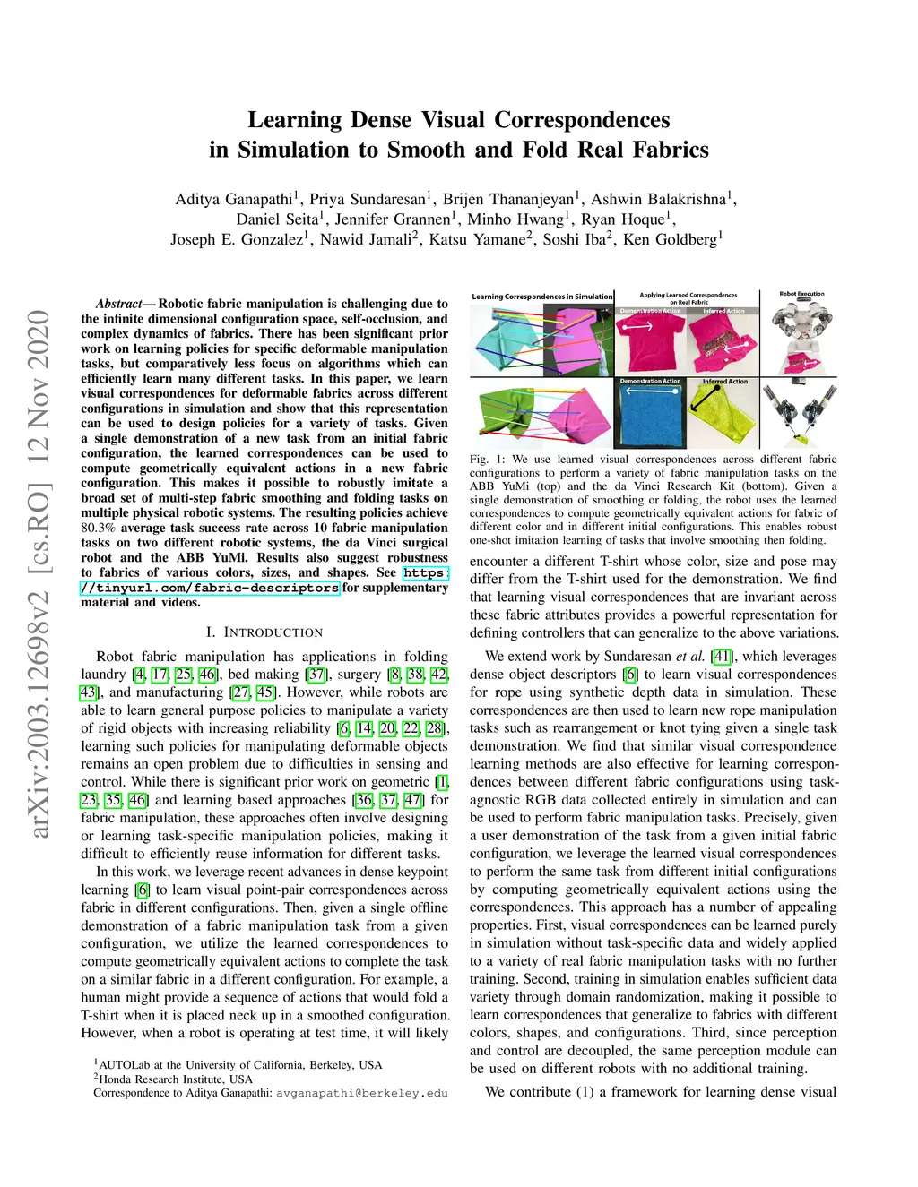 Learning Dense Visual Correspondences in Simulation to Smooth and Fold