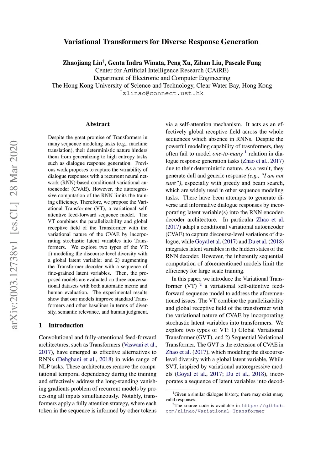 Despite the great promise of Transformers in many sequence modeling tasks (e.g., machine translation), their deterministic nature hinders them from generalizing to high entropy tasks such as dialogue response generation. Previous work proposes to capture the variability of dialogue responses with a recurrent neural network (RNN)-based conditional variational autoencoder (CVAE). However, the autoregressive computation of the RNN limits the training efficiency. Therefore, we propose the Variational Transformer (VT), a variational self-attentive feed-forward sequence model. The VT combines the parallelizability and global receptive field of the Transformer with the variational nature of the CVAE by incorporating stochastic latent variables into Transformers. We explore two types of the VT: 1) modeling the discourse-level diversity with a global latent variable; and 2) augmenting the Transformer decoder with a sequence of fine-grained latent variables. Then, the proposed models are evaluated on three conversational datasets with both automatic metric and human evaluation. The experimental results show that our models improve standard Transformers and other baselines in terms of diversity, semantic relevance, and human judgment.