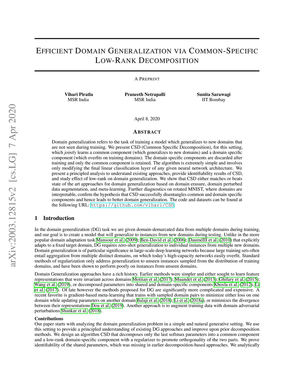 Domain generalization refers to the task of training a model which generalizes to new domains that are not seen during training. We present CSD (Common Specific Decomposition), for this setting,which jointly learns a common component (which generalizes to new domains) and a domain specific component (which overfits on training domains). The domain specific components are discarded after training and only the common component is retained. The algorithm is extremely simple and involves only modifying the final linear classification layer of any given neural network architecture. We present a principled analysis to understand existing approaches, provide identifiability results of CSD,and study effect of low-rank on domain generalization. We show that CSD either matches or beats state of the art approaches for domain generalization based on domain erasure, domain perturbed data augmentation, and meta-learning. Further diagnostics on rotated MNIST, where domains are interpretable, confirm the hypothesis that CSD successfully disentangles common and domain specific components and hence leads to better domain generalization.
