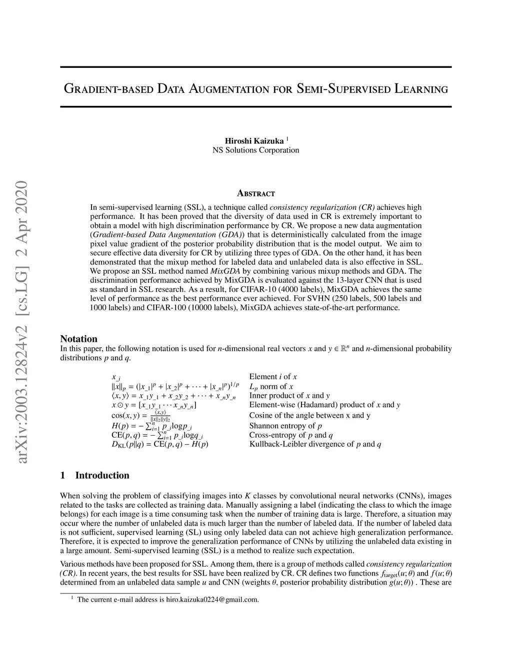 In semi-supervised learning (SSL), a technique called consistency regularization (CR) achieves high performance. It has been proved that the diversity of data used in CR is extremely important to obtain a model with high discrimination performance by CR. We propose a new data augmentation (Gradient-based Data Augmentation (GDA)) that is deterministically calculated from the image pixel value gradient of the posterior probability distribution that is the model output. We aim to secure effective data diversity for CR by utilizing three types of GDA. On the other hand, it has been demonstrated that the mixup method for labeled data and unlabeled data is also effective in SSL. We propose an SSL method named MixGDA by combining various mixup methods and GDA. The discrimination performance achieved by MixGDA is evaluated against the 13-layer CNN that is used as standard in SSL research. As a result, for CIFAR-10 (4000 labels), MixGDA achieves the same level of performance as the best performance ever achieved. For SVHN (250 labels, 500 labels and 1000 labels) and CIFAR-100 (10000 labels), MixGDA achieves state-of-the-art performance.