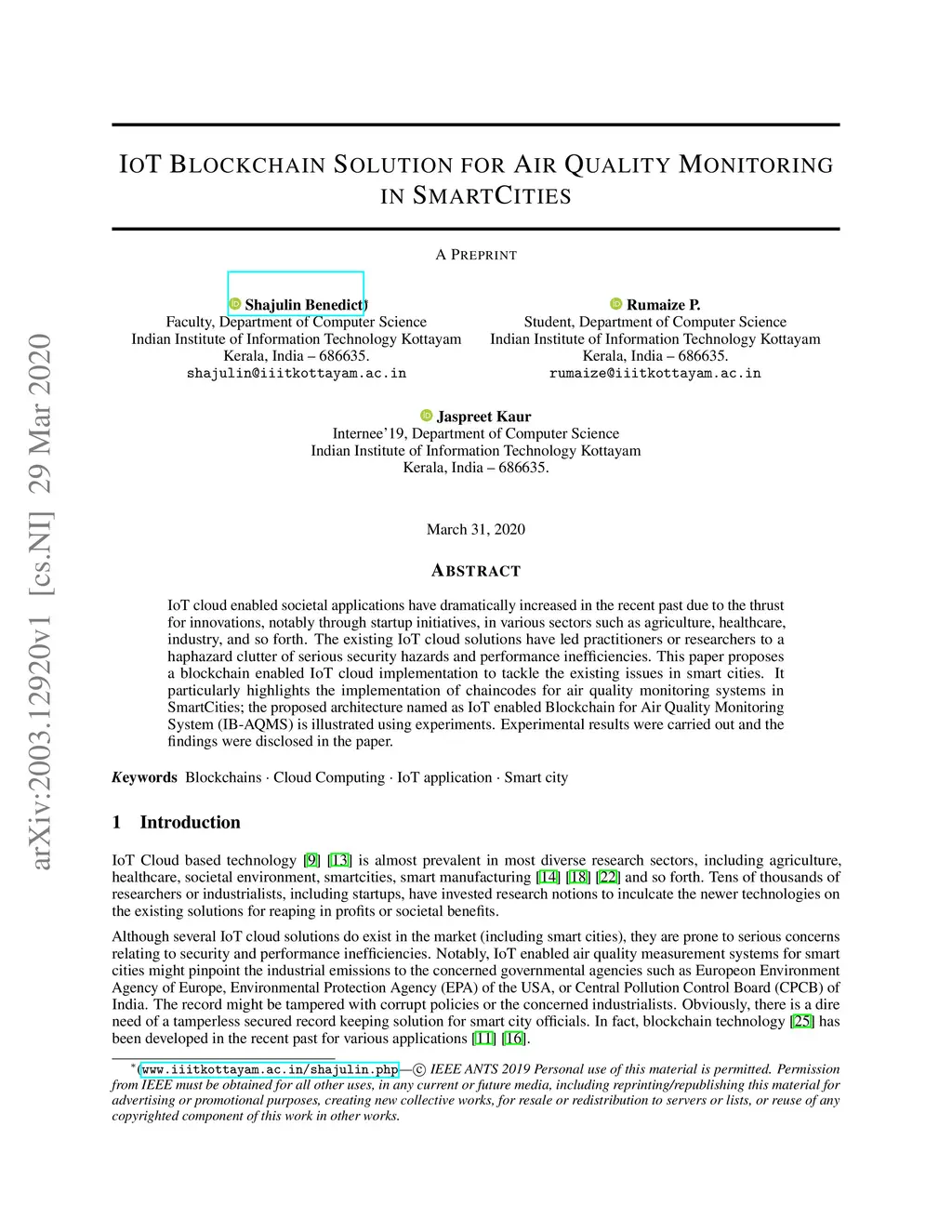 IoT Blockchain Solution for Air Quality Monitoring in SmartCities