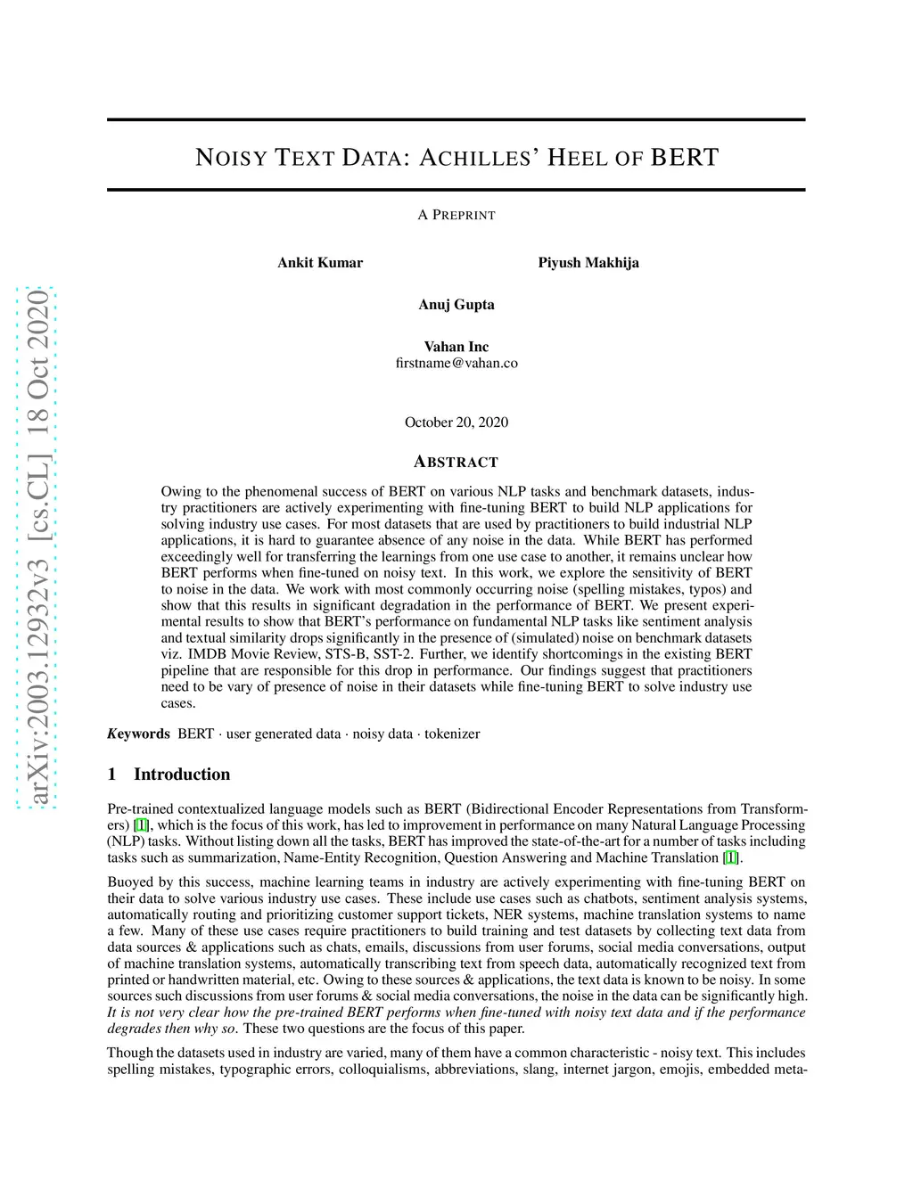 Owing to BERT's phenomenal success on various NLP tasks and benchmark datasets, industry practitioners have started to experiment with incorporating BERT to build applications to solve industry use cases. Industrial NLP applications are known to deal with much more noisy data as compared to benchmark datasets. In this work we systematically show that when the text data is noisy, there is a significant degradation in the performance of BERT. While this work is motivated from our business use case of building NLP applications for user generated text data which is known to be very noisy, our findings are applicable across various use cases in the industry. Specifically, we show that BERT's performance on fundamental tasks like sentiment analysis and textual similarity drops significantly as we introduce noise in data in the form of spelling mistakes and typos. For our experiments we use three well known datasets - IMDB movie reviews, SST-2 and STS-B to measure the performance. Further, we identify the shortcomings in the BERT pipeline that are responsible for this drop in performance.