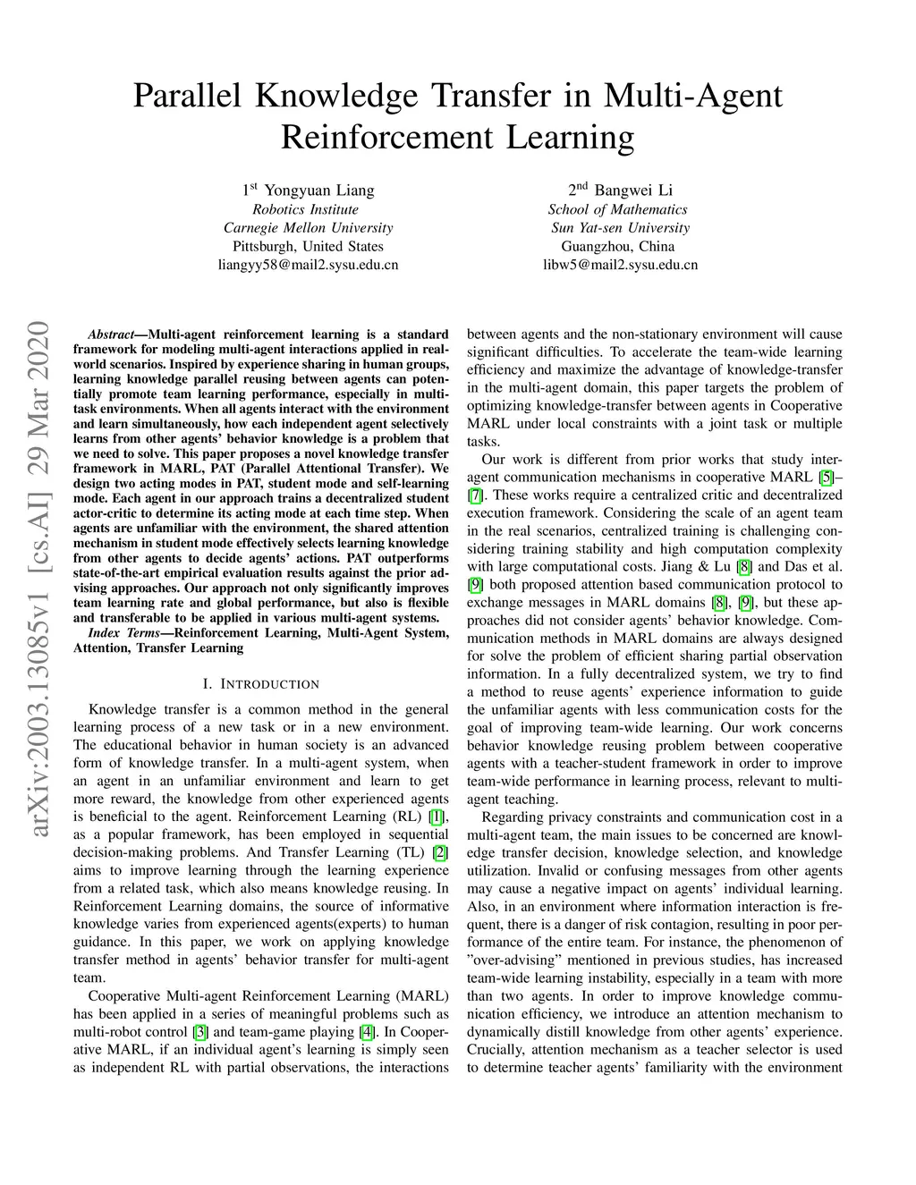 Multi-agent reinforcement learning is a standard framework for modeling multi-agent interactions applied in real-world scenarios. Inspired by experience sharing in human groups, learning knowledge parallel reusing between agents can potentially promote team learning performance, especially in multi-task environments. When all agents interact with the environment and learn simultaneously, how each independent agent selectively learns from other agents' behavior knowledge is a problem that we need to solve. This paper proposes a novel knowledge transfer framework in MARL, PAT (Parallel Attentional Transfer). We design two acting modes in PAT, student mode and self-learning mode. Each agent in our approach trains a decentralized student actor-critic to determine its acting mode at each time step. When agents are unfamiliar with the environment, the shared attention mechanism in student mode effectively selects learning knowledge from other agents to decide agents' actions. PAT outperforms state-of-the-art empirical evaluation results against the prior advising approaches. Our approach not only significantly improves team learning rate and global performance, but also is flexible and transferable to be applied in various multi-agent systems.